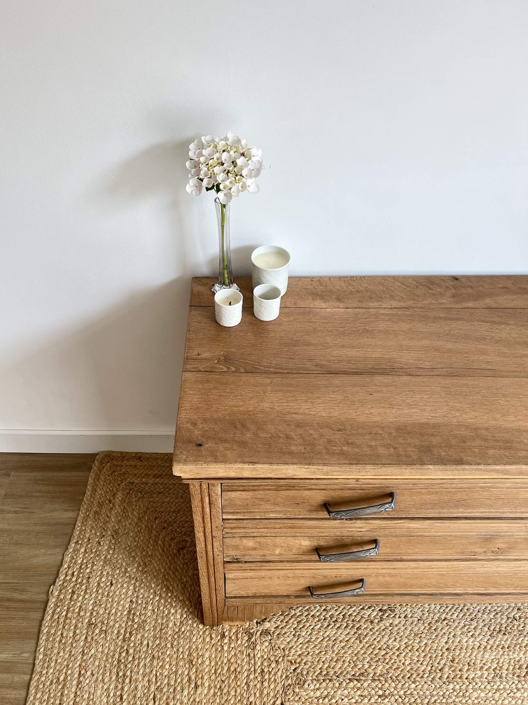 Les poignées d’origine ont été nettoyées et polies : elles conservent une jolie patine.