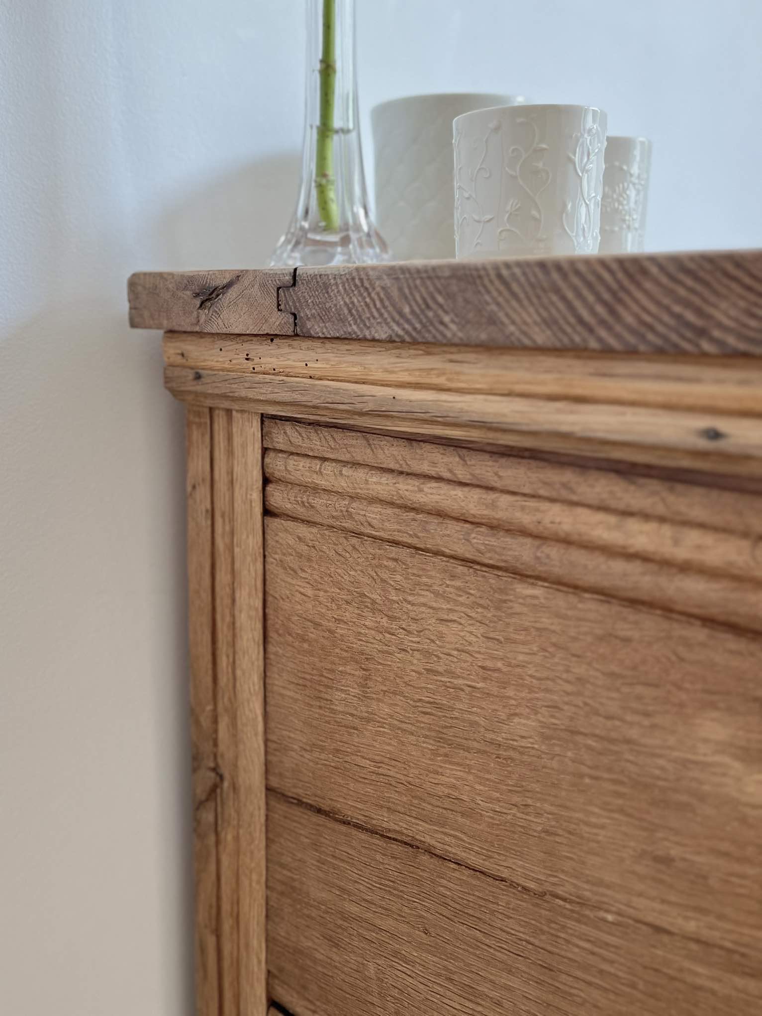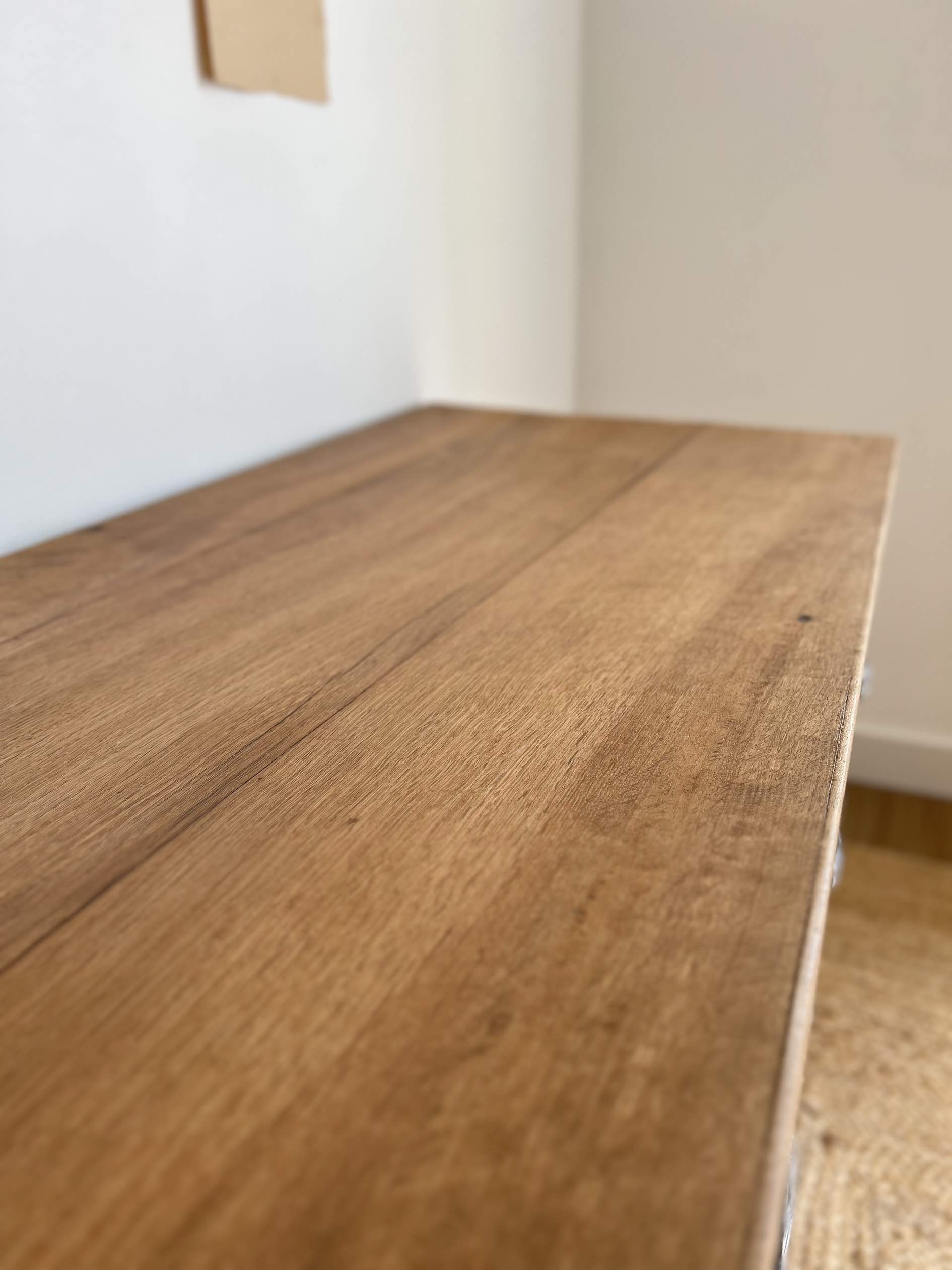 – Il existe un léger jour entre les deux pièces rainurées constituant le côté gauche de la commode (voir photographies).