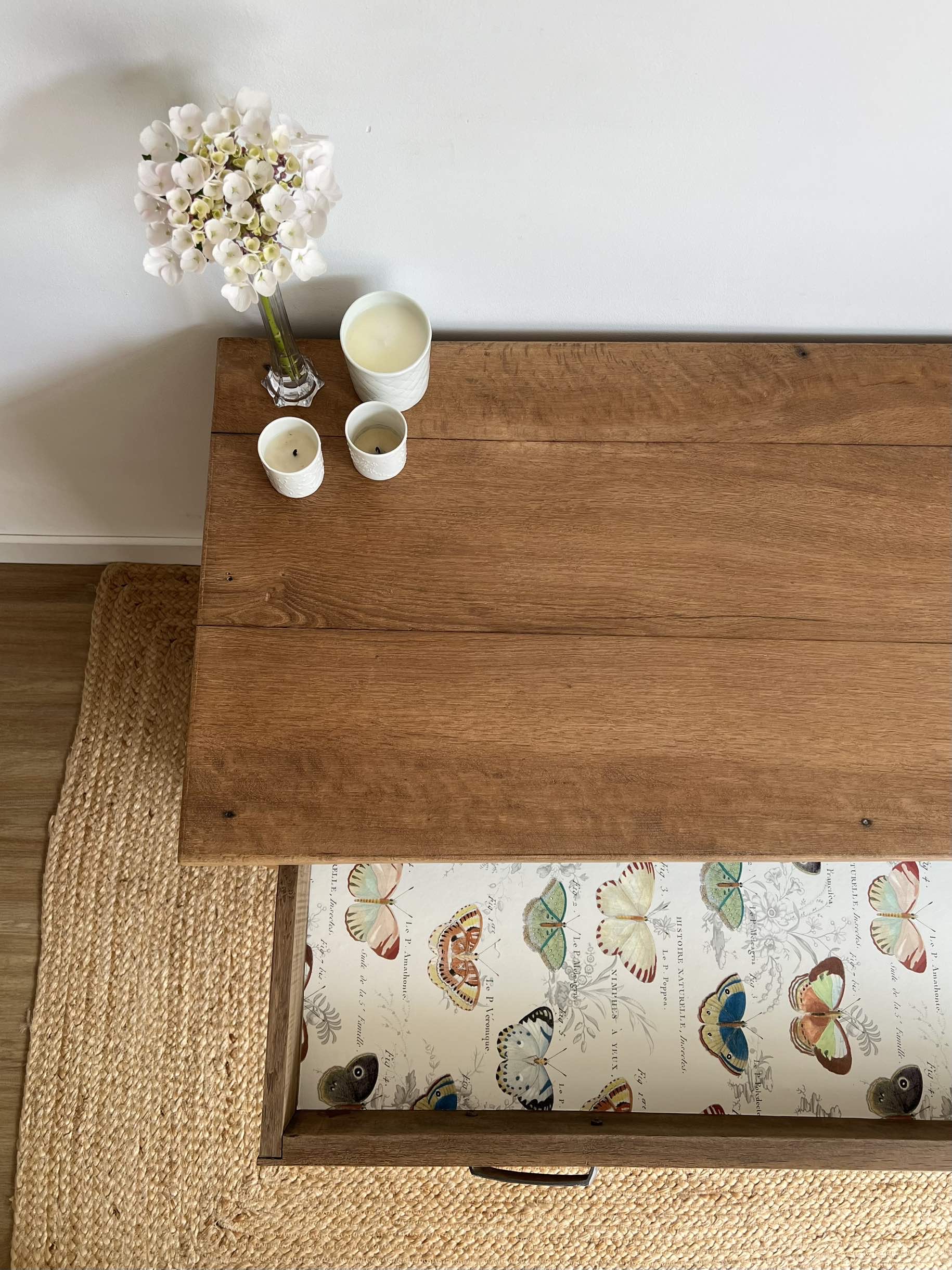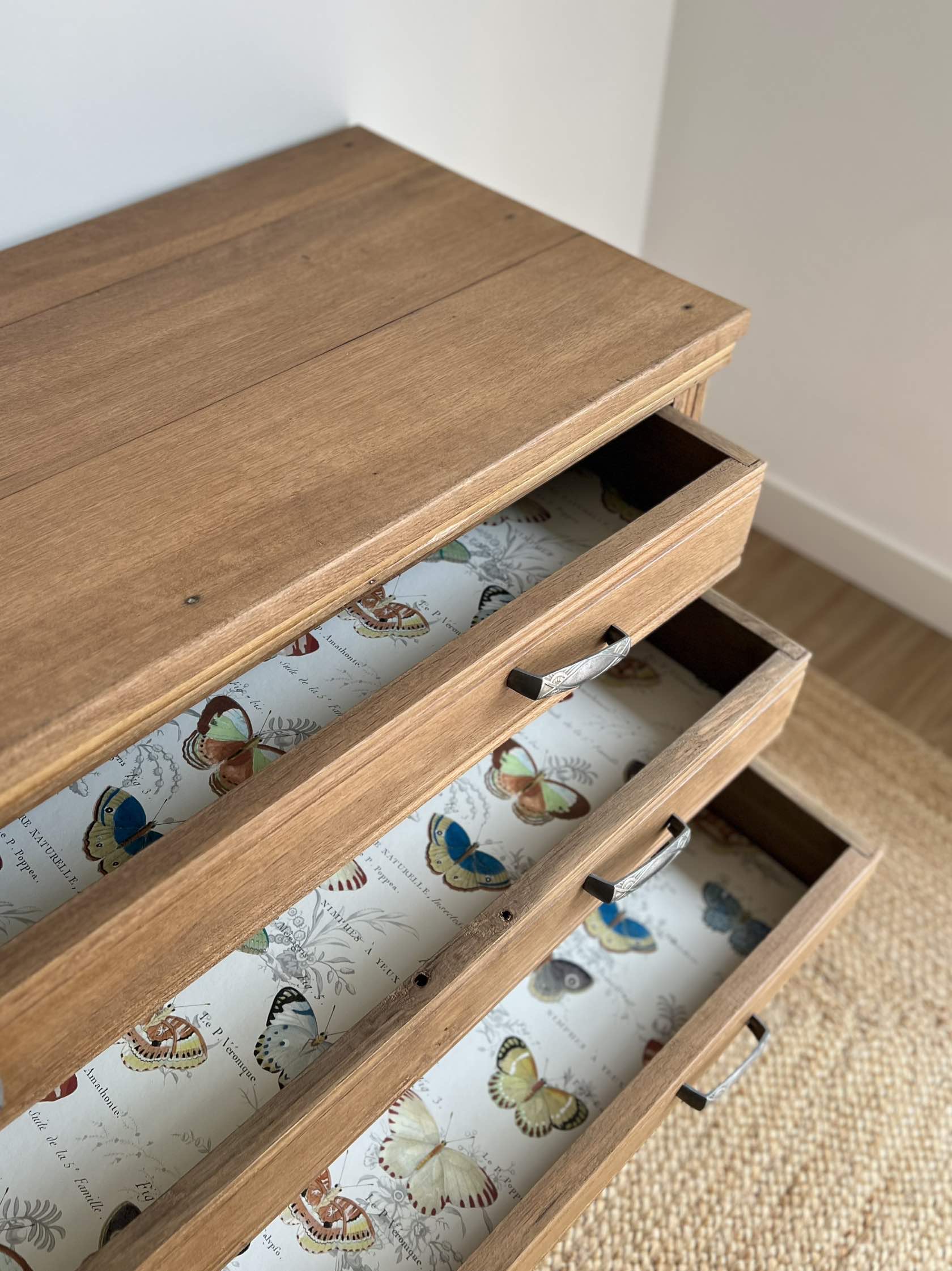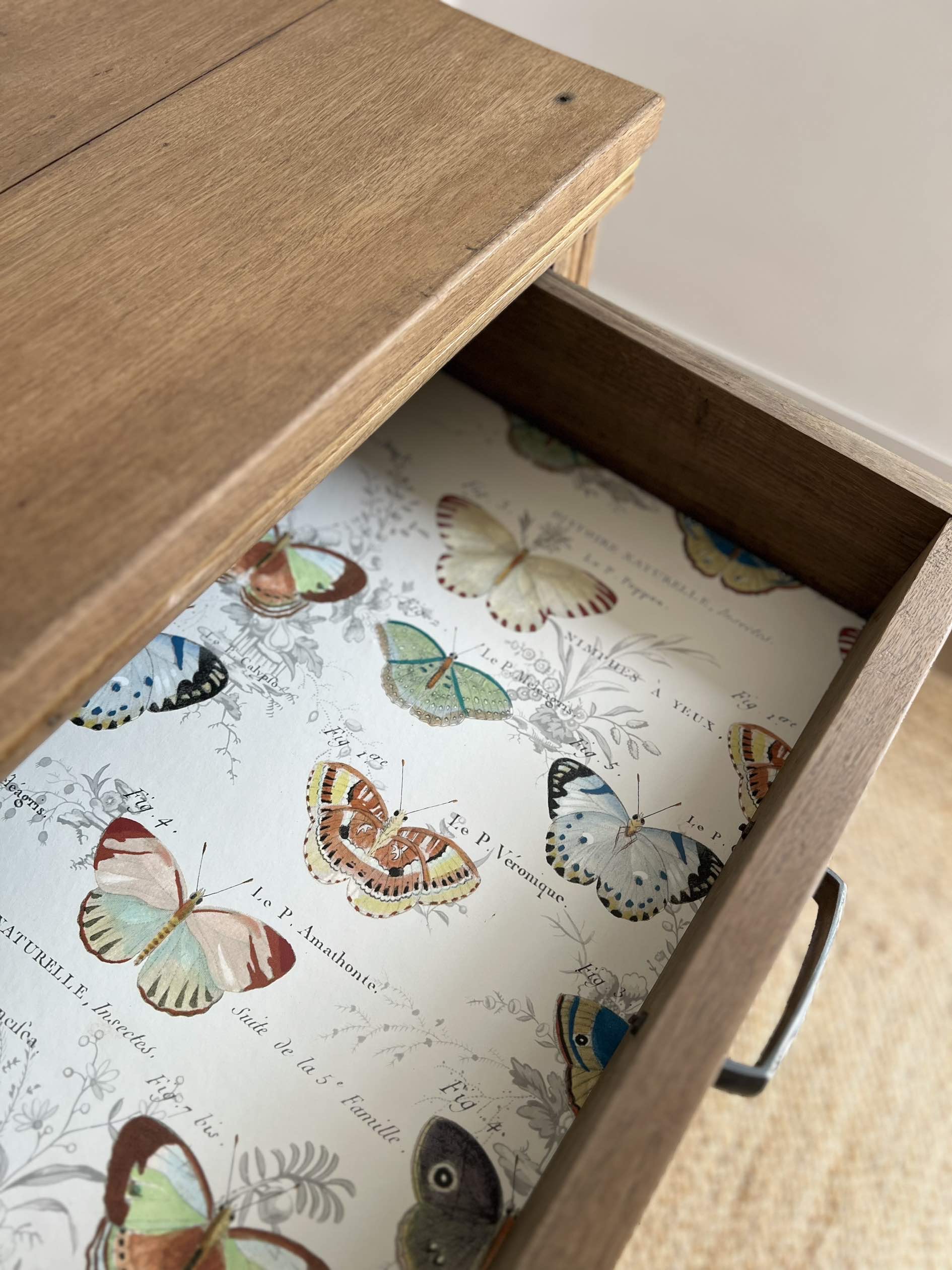 Le fond de ses trois tiroirs, qui coulissent parfaitement, a été tapissé d’un papier peint haut de gamme aux motifs papillons, à la façon des planches animalières anciennes.