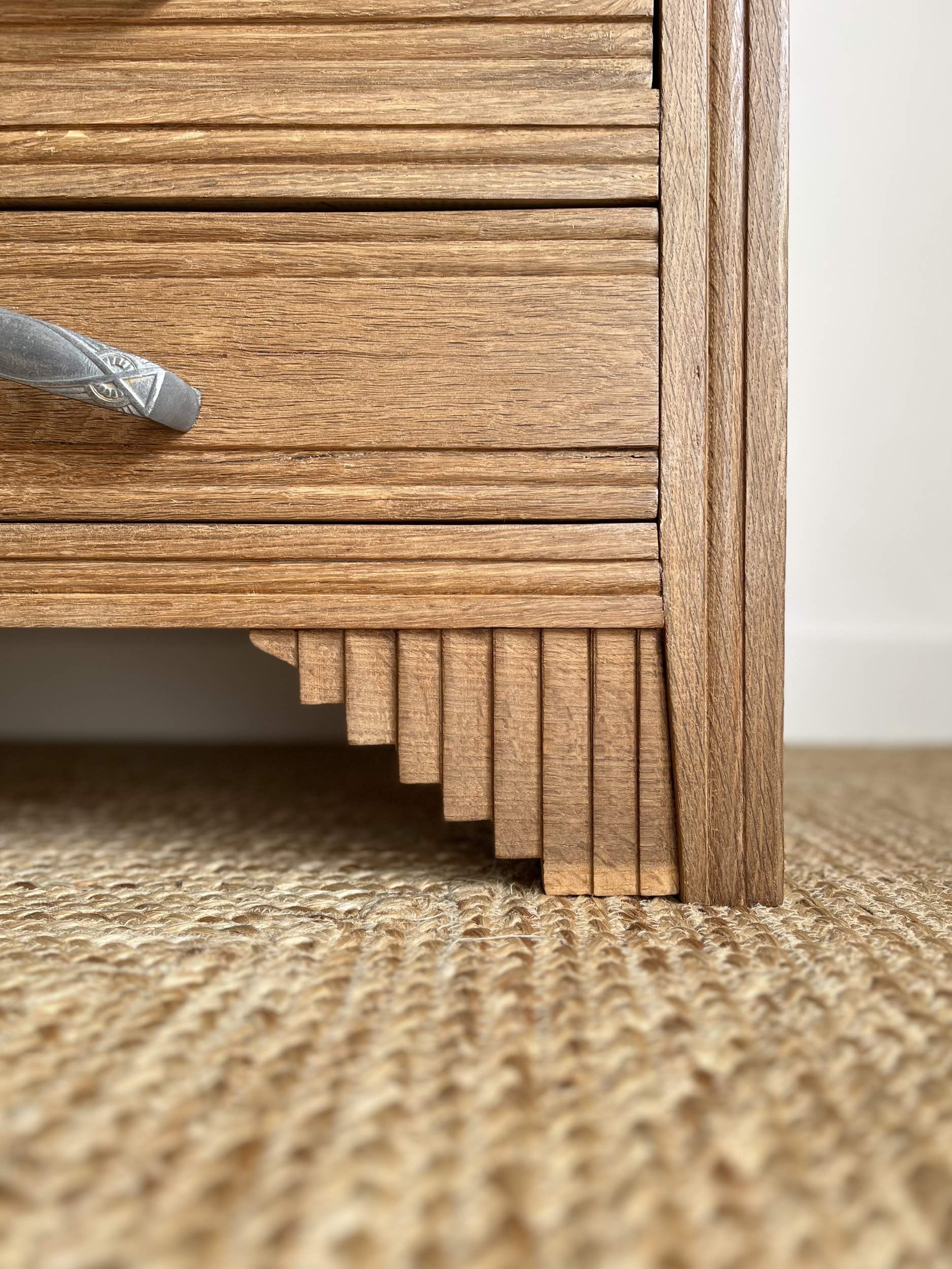 Son style art-déco s’affiche fièrement avec ses rainures, des pieds crantés et ses poignées ouvragées.