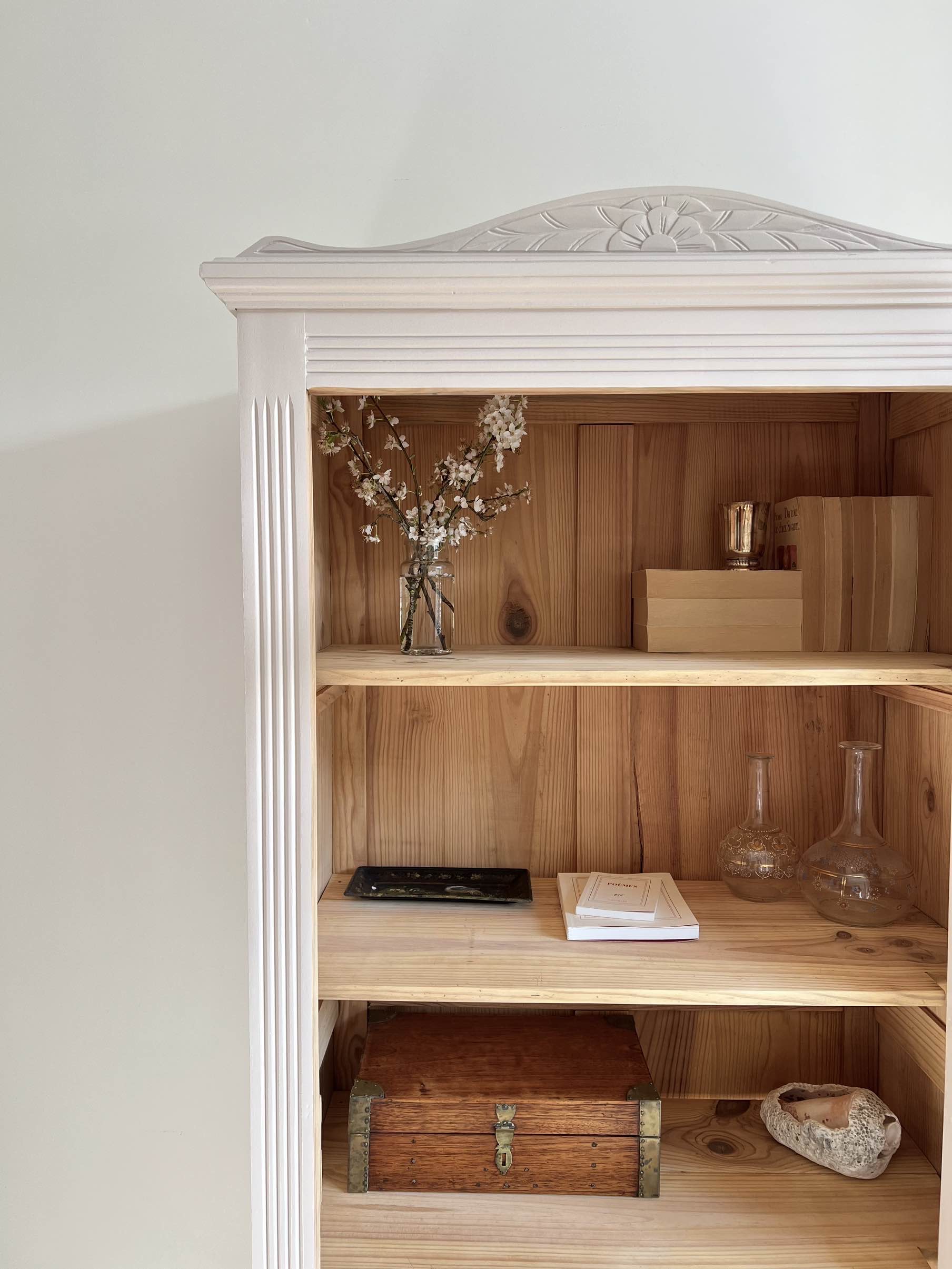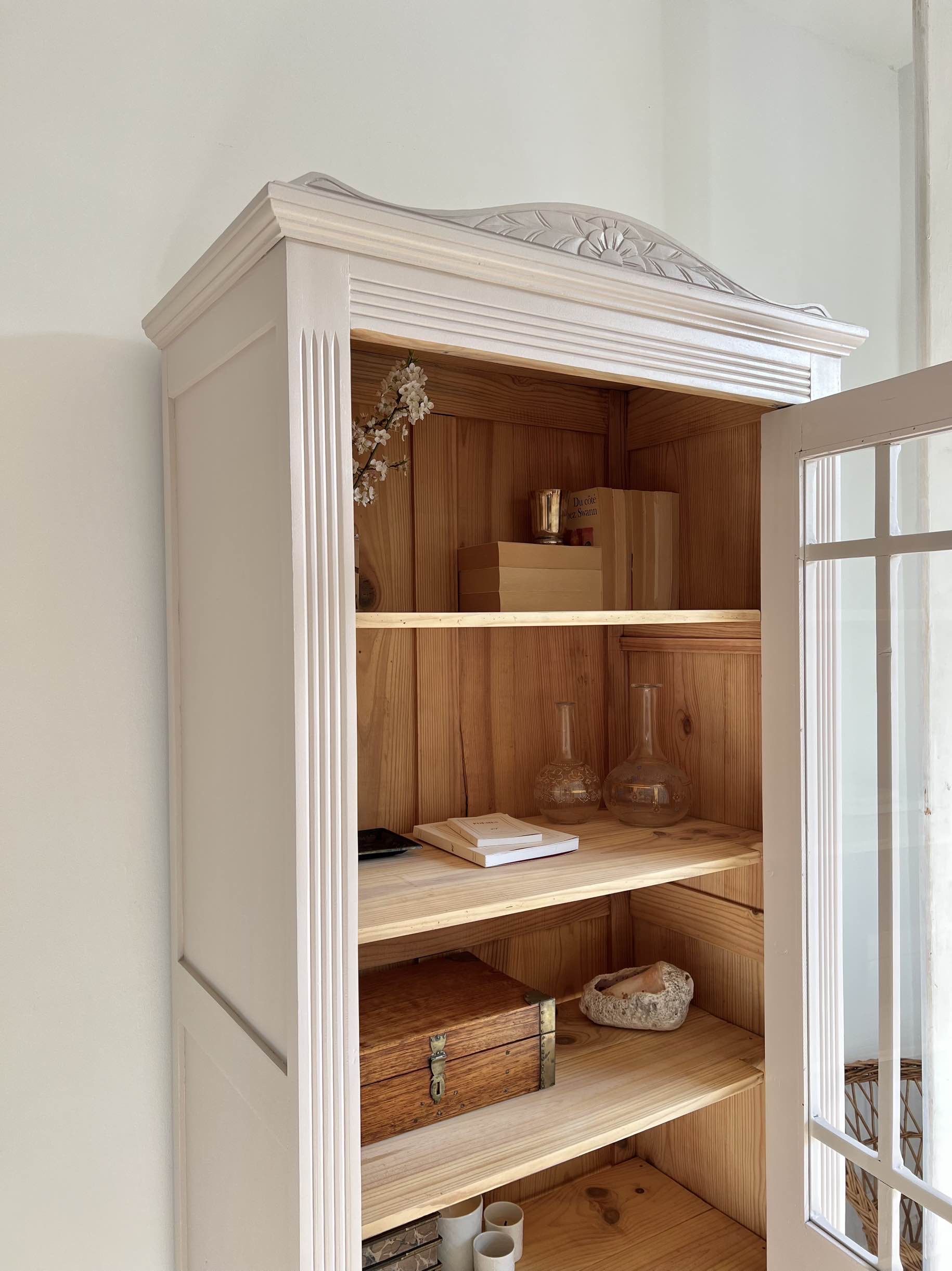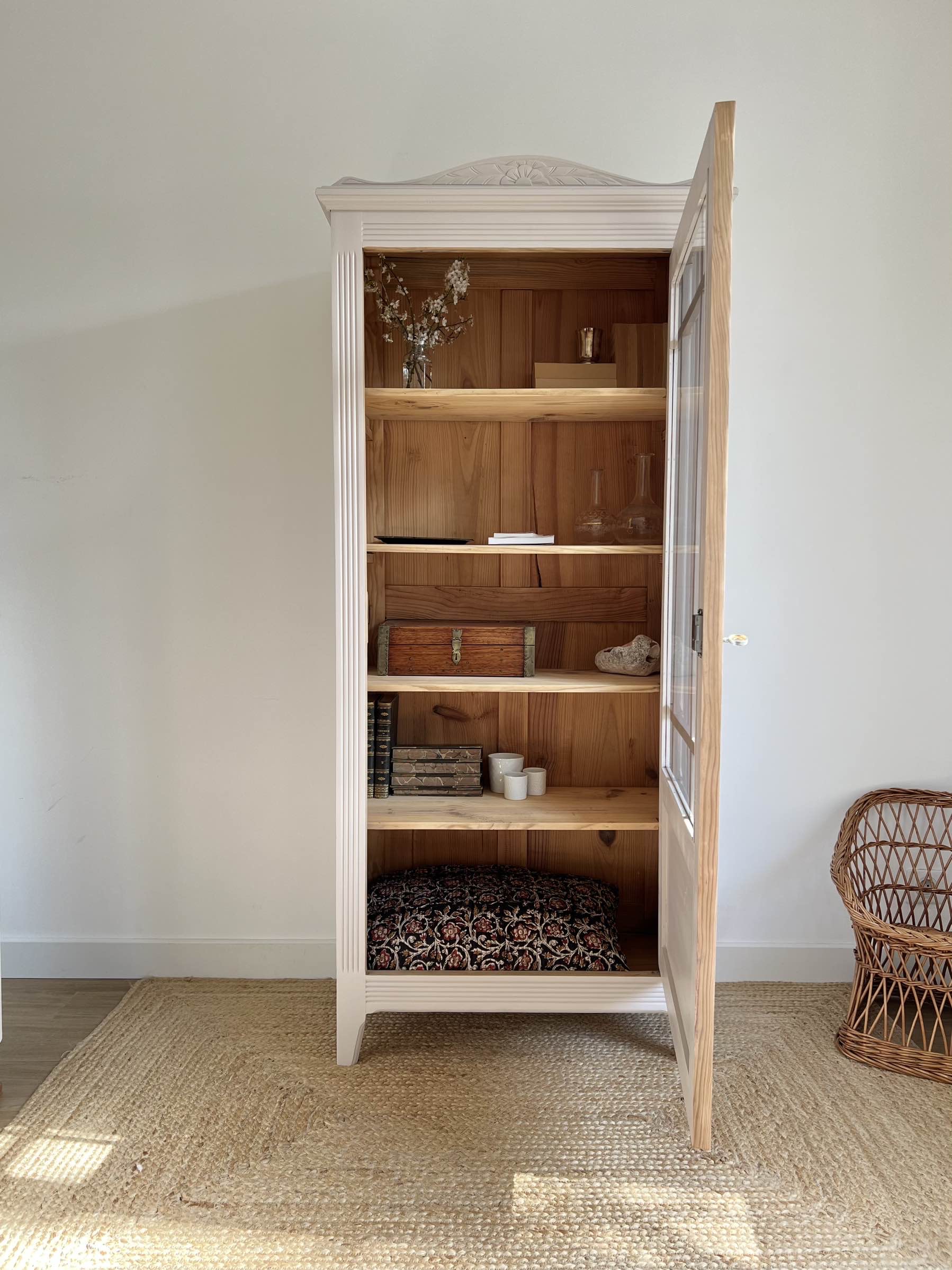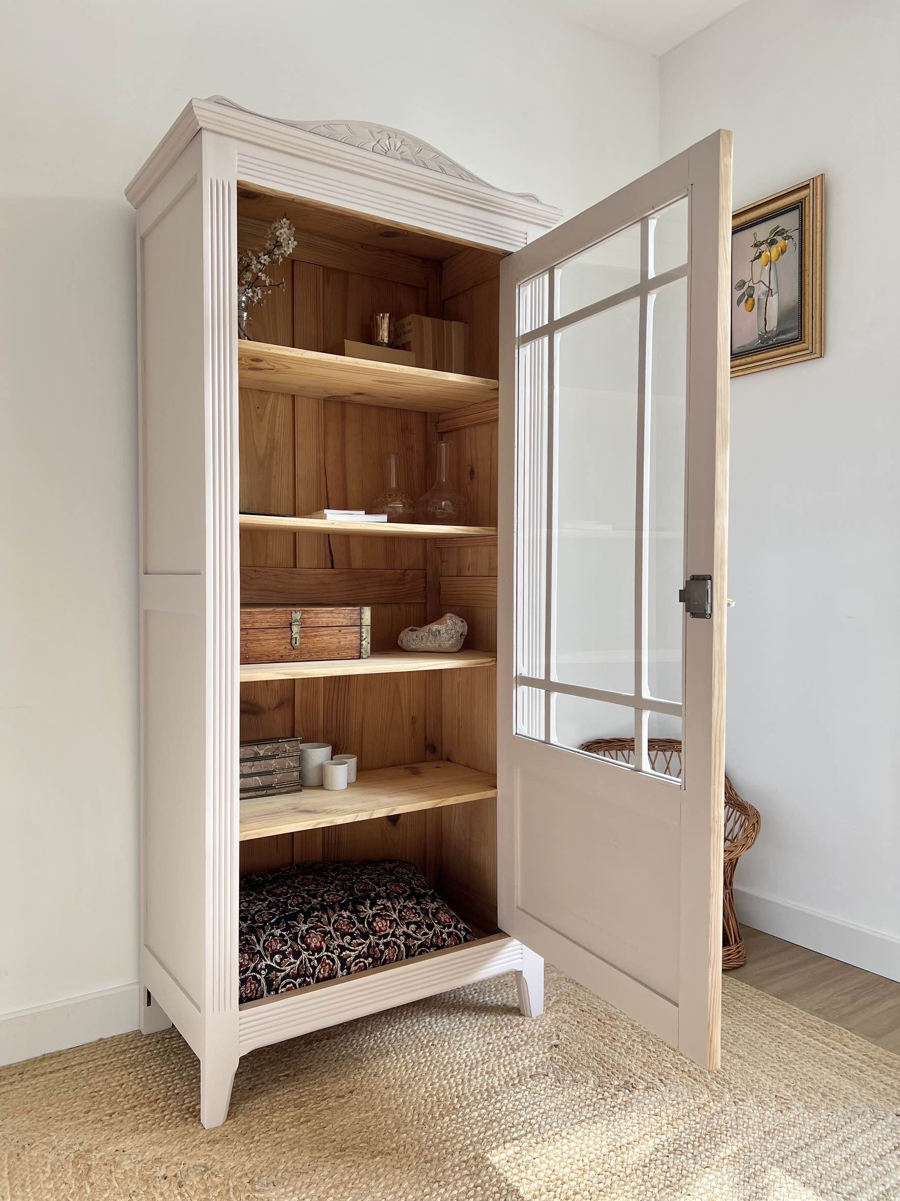 L’extérieur du meuble a été poncé et peint dans un beige chaud et enveloppant légèrement rosé, qui lui donne de l’éclat (peinture de qualité professionnelle Unikalo – gamme biosourcée Naé, finition satinée – protection par un vernis incolore).