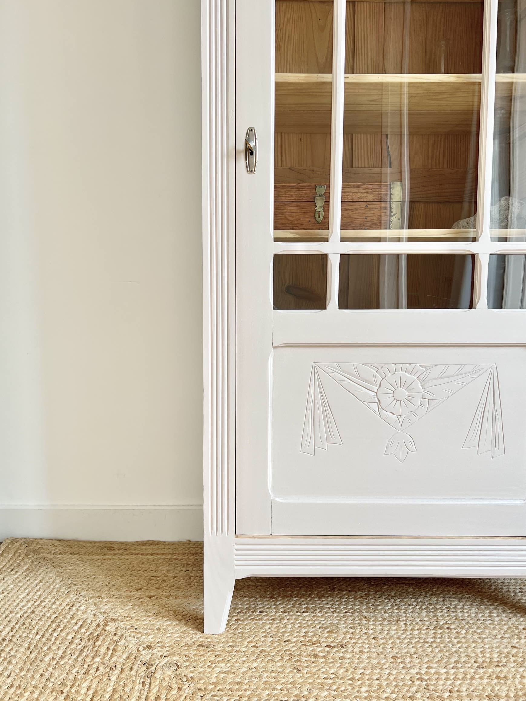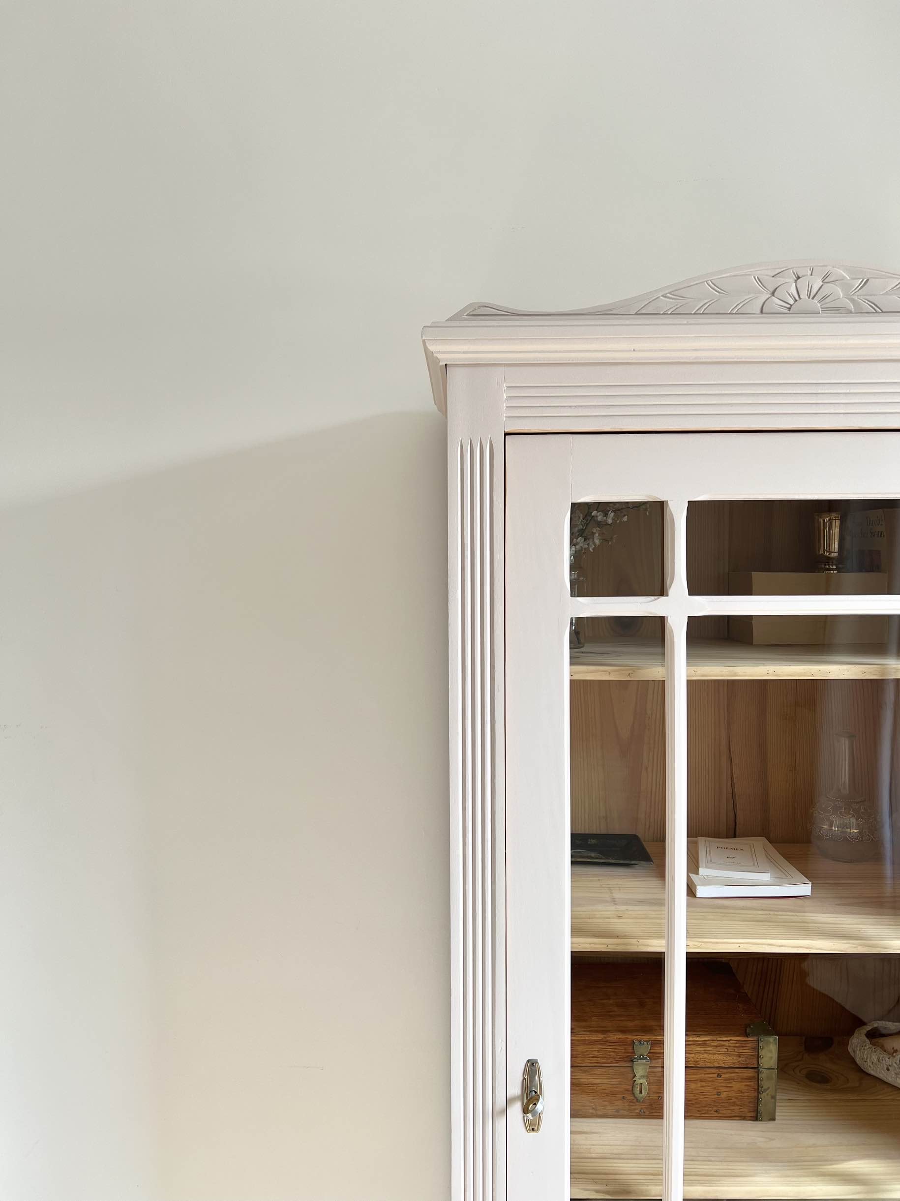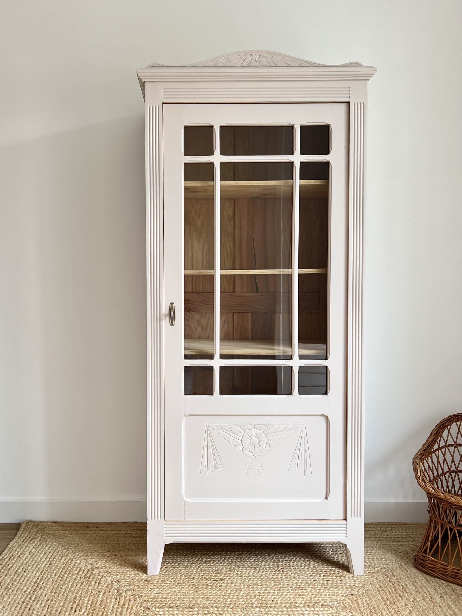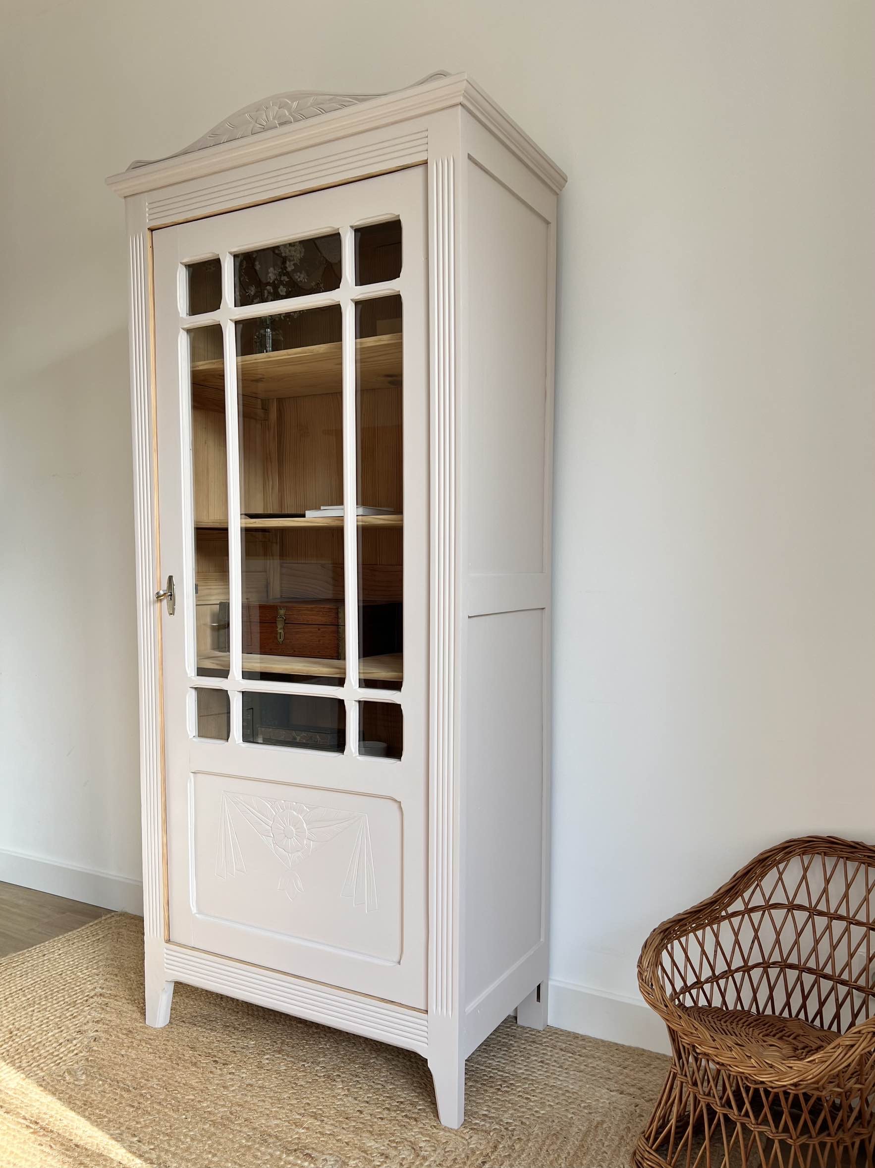 L’extérieur du meuble a été poncé et peint dans un beige chaud et enveloppant légèrement rosé, qui lui donne de l’éclat (peinture de qualité professionnelle Unikalo – gamme biosourcée Naé, finition satinée – protection par un vernis incolore).