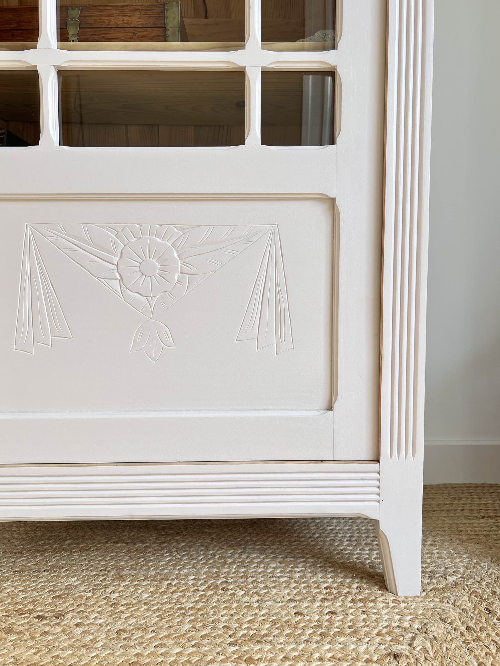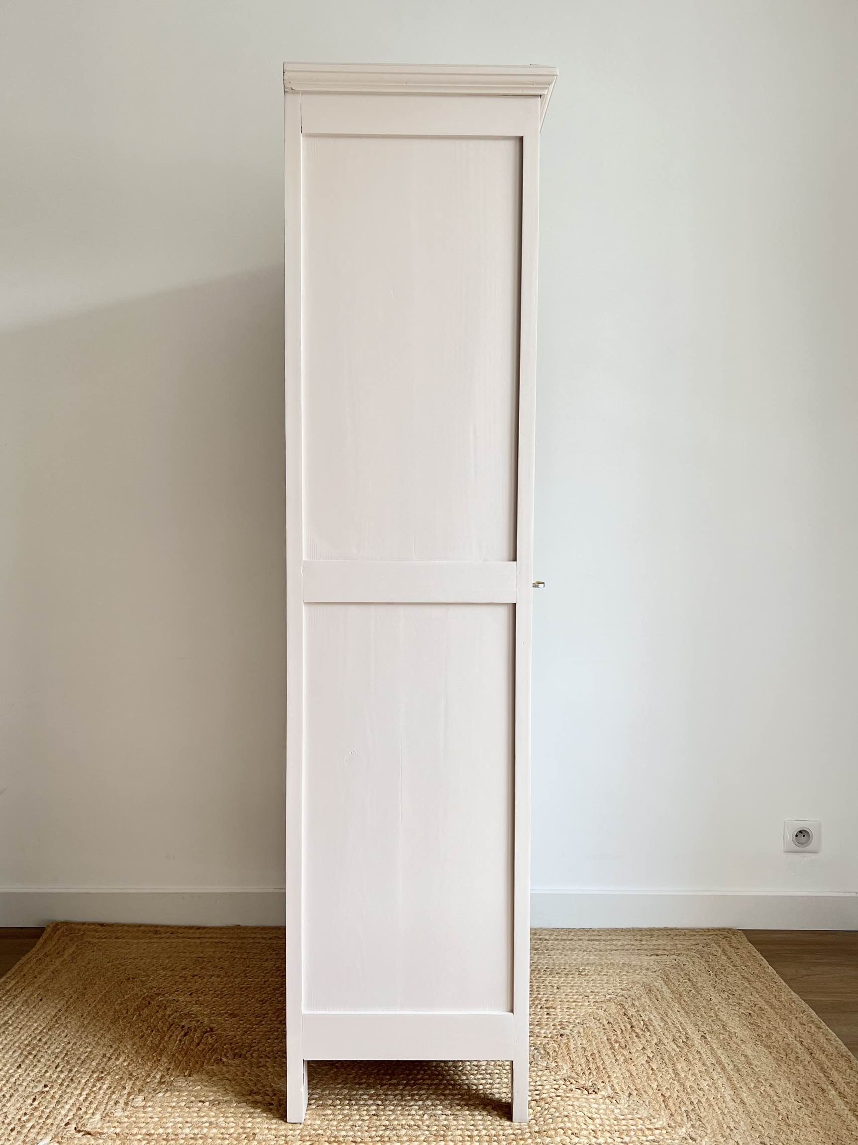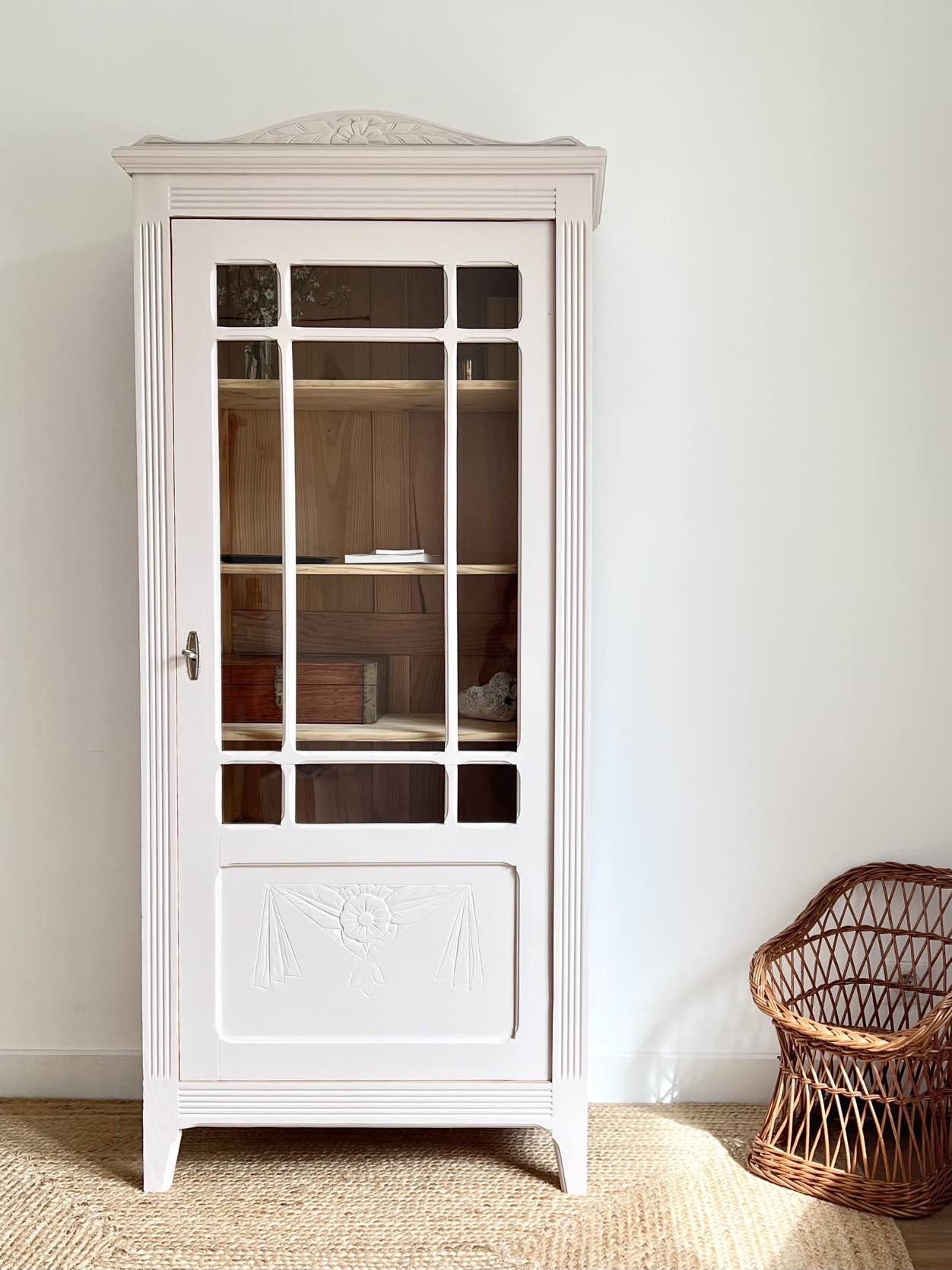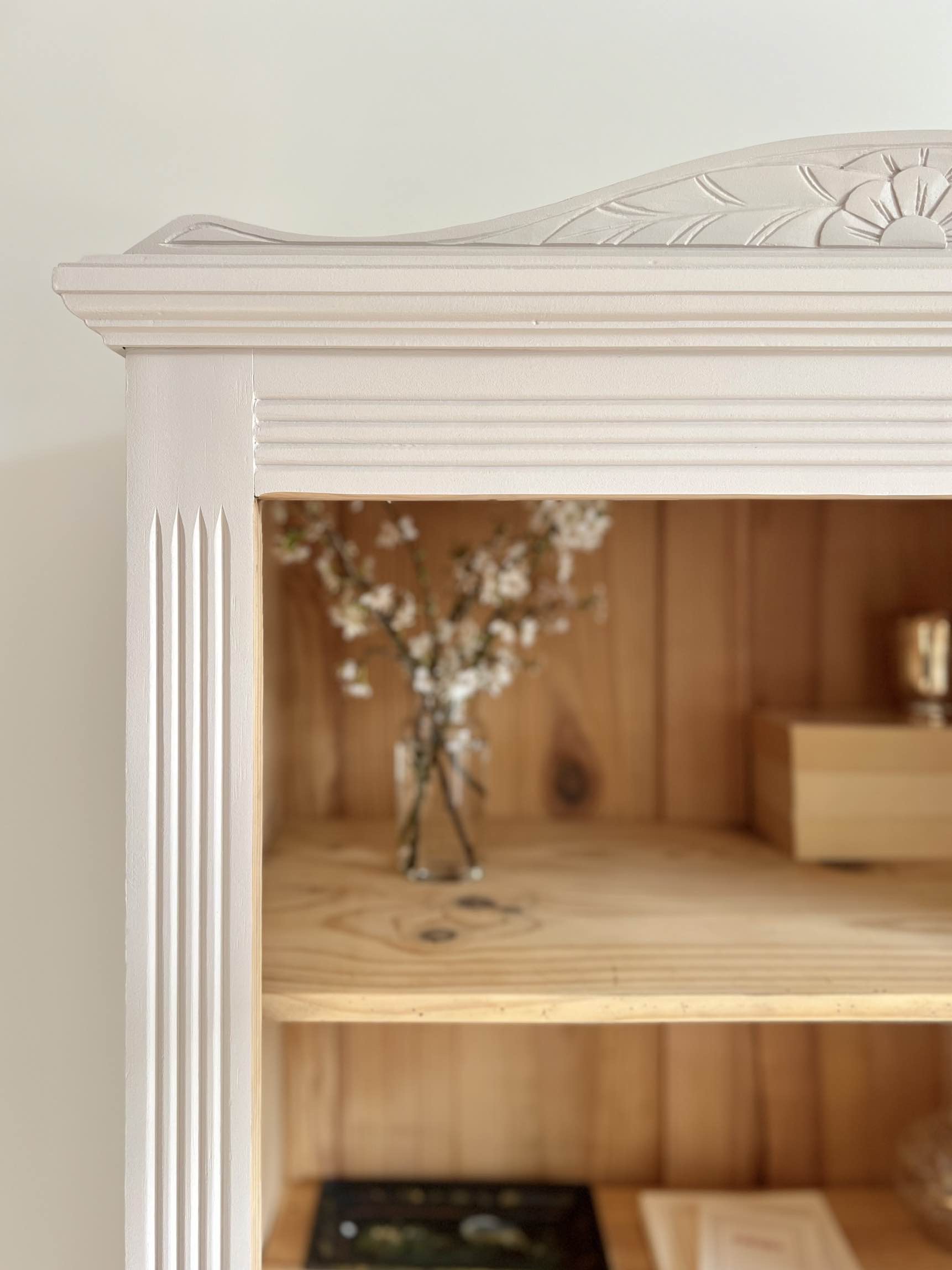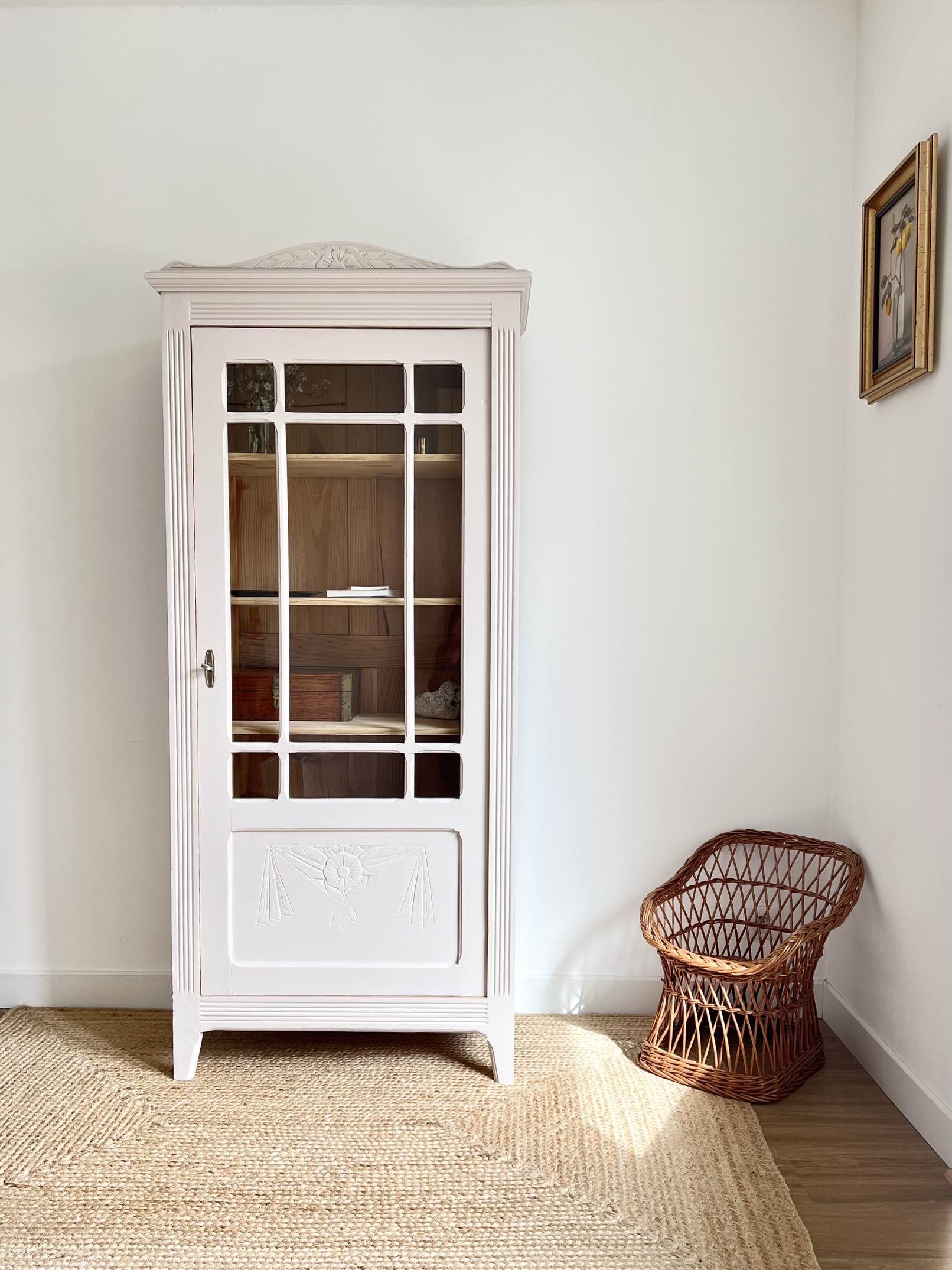 L’extérieur du meuble a été poncé et peint dans un beige chaud et enveloppant légèrement rosé, qui lui donne de l’éclat (peinture de qualité professionnelle Unikalo – gamme biosourcée Naé, finition satinée – protection par un vernis incolore).
