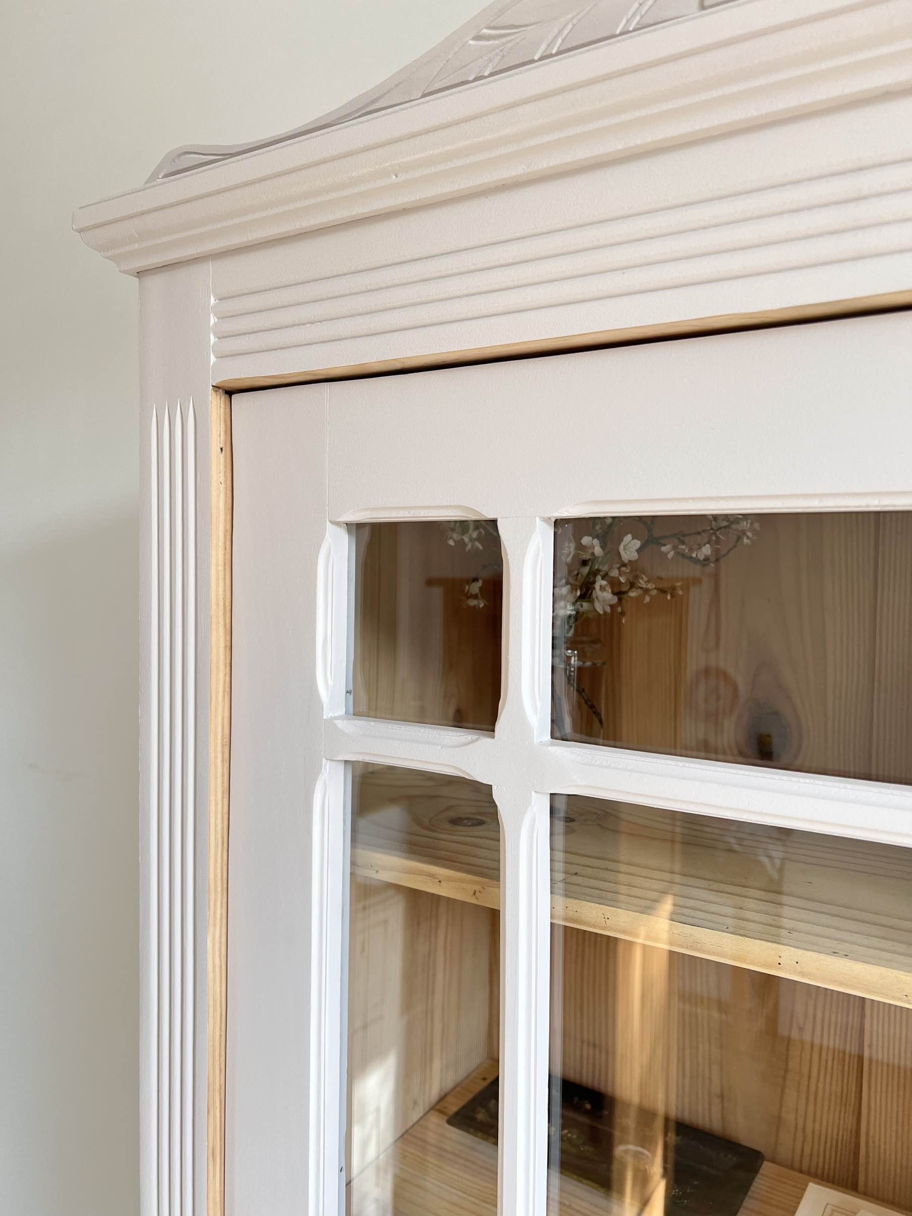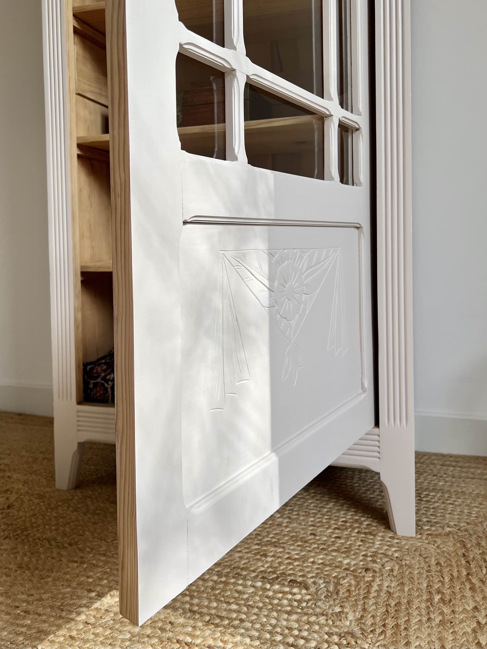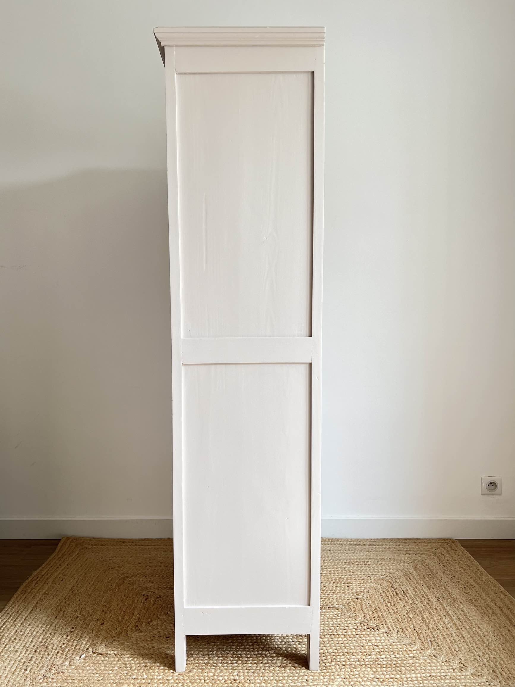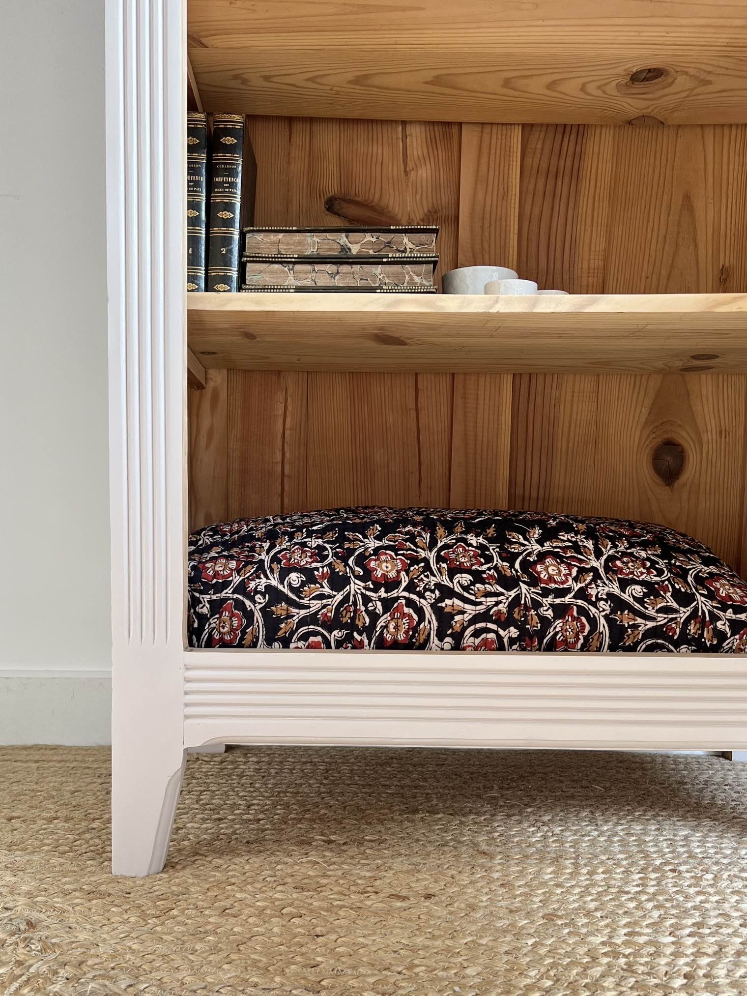 L’extérieur du meuble a été poncé et peint dans un beige chaud et enveloppant légèrement rosé, qui lui donne de l’éclat (peinture de qualité professionnelle Unikalo – gamme biosourcée Naé, finition satinée – protection par un vernis incolore).