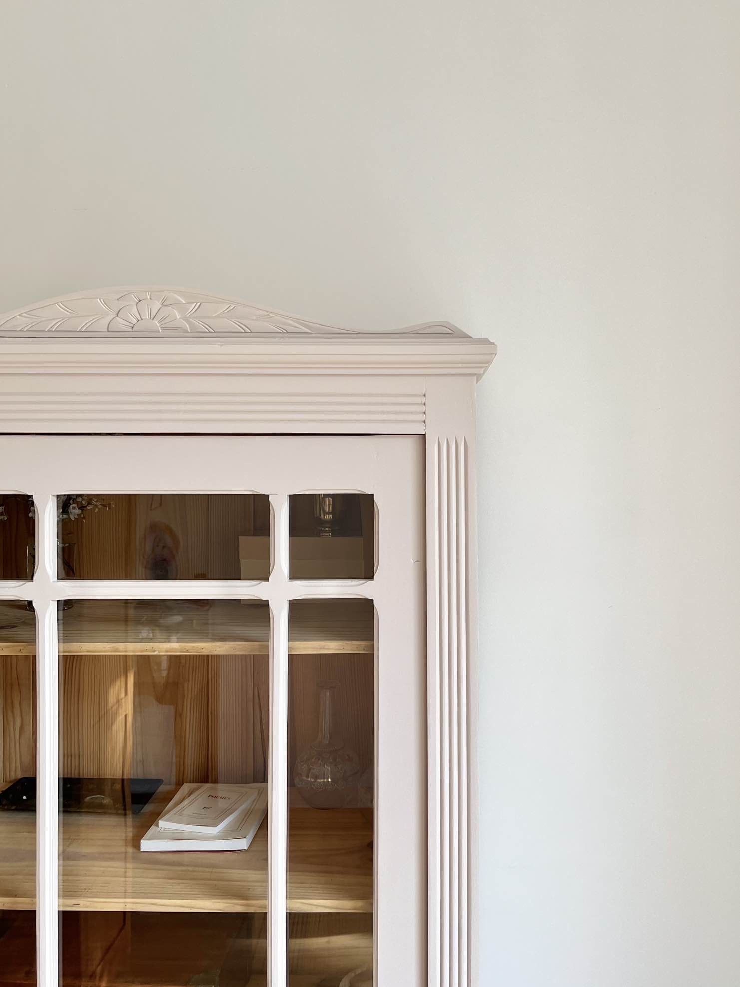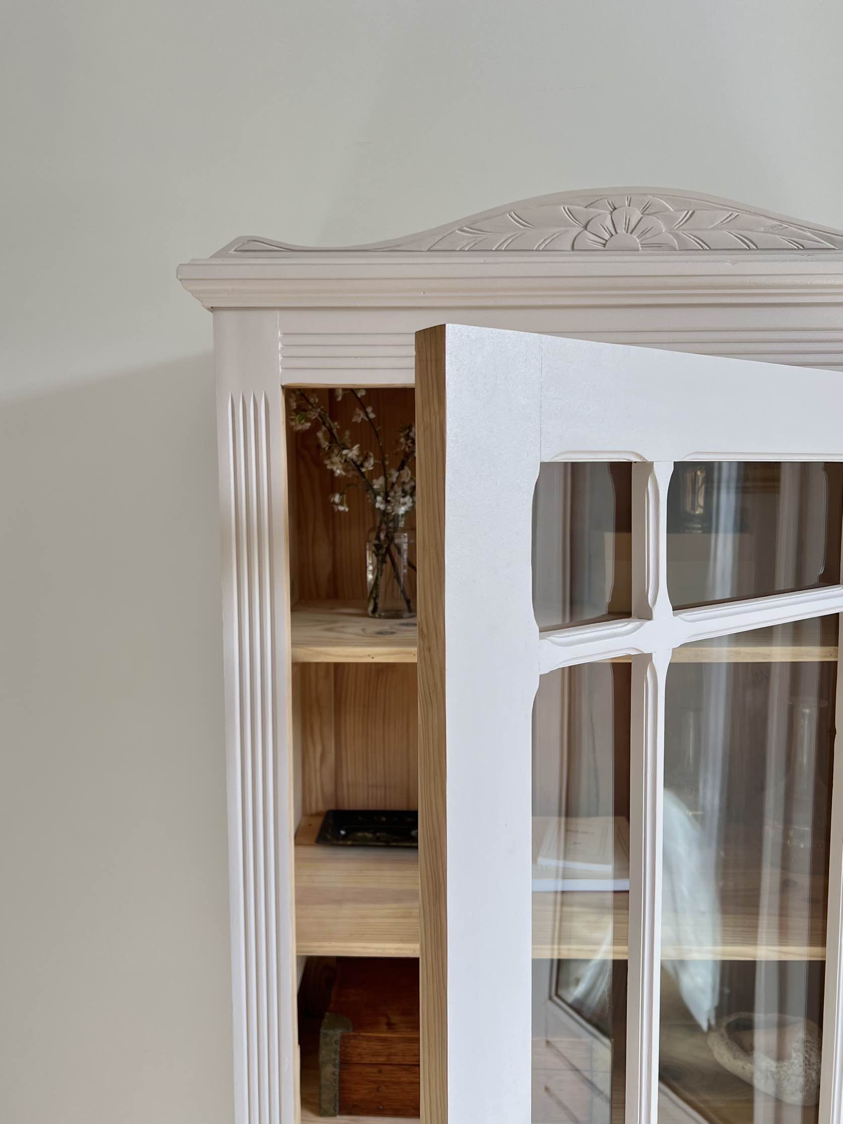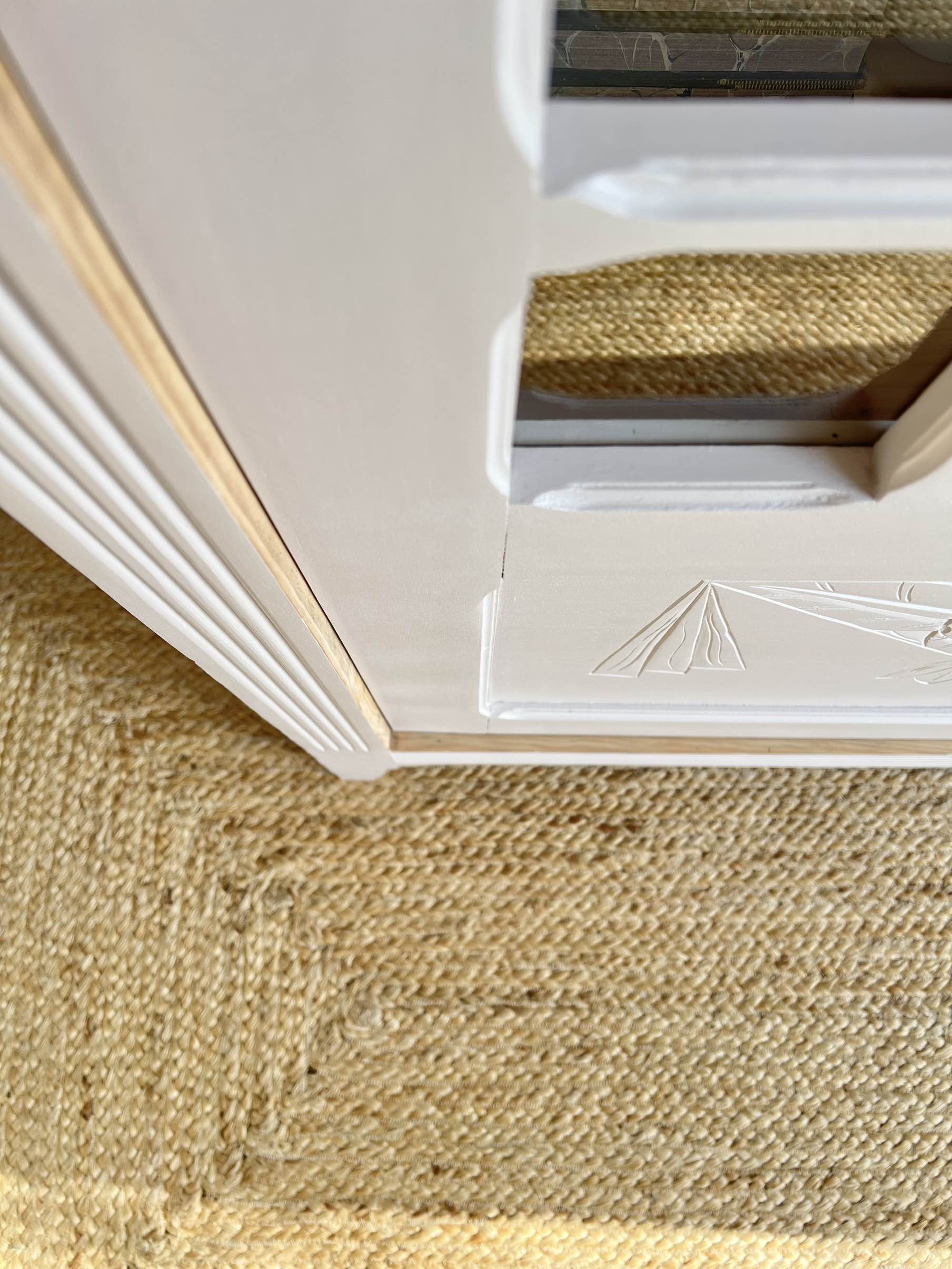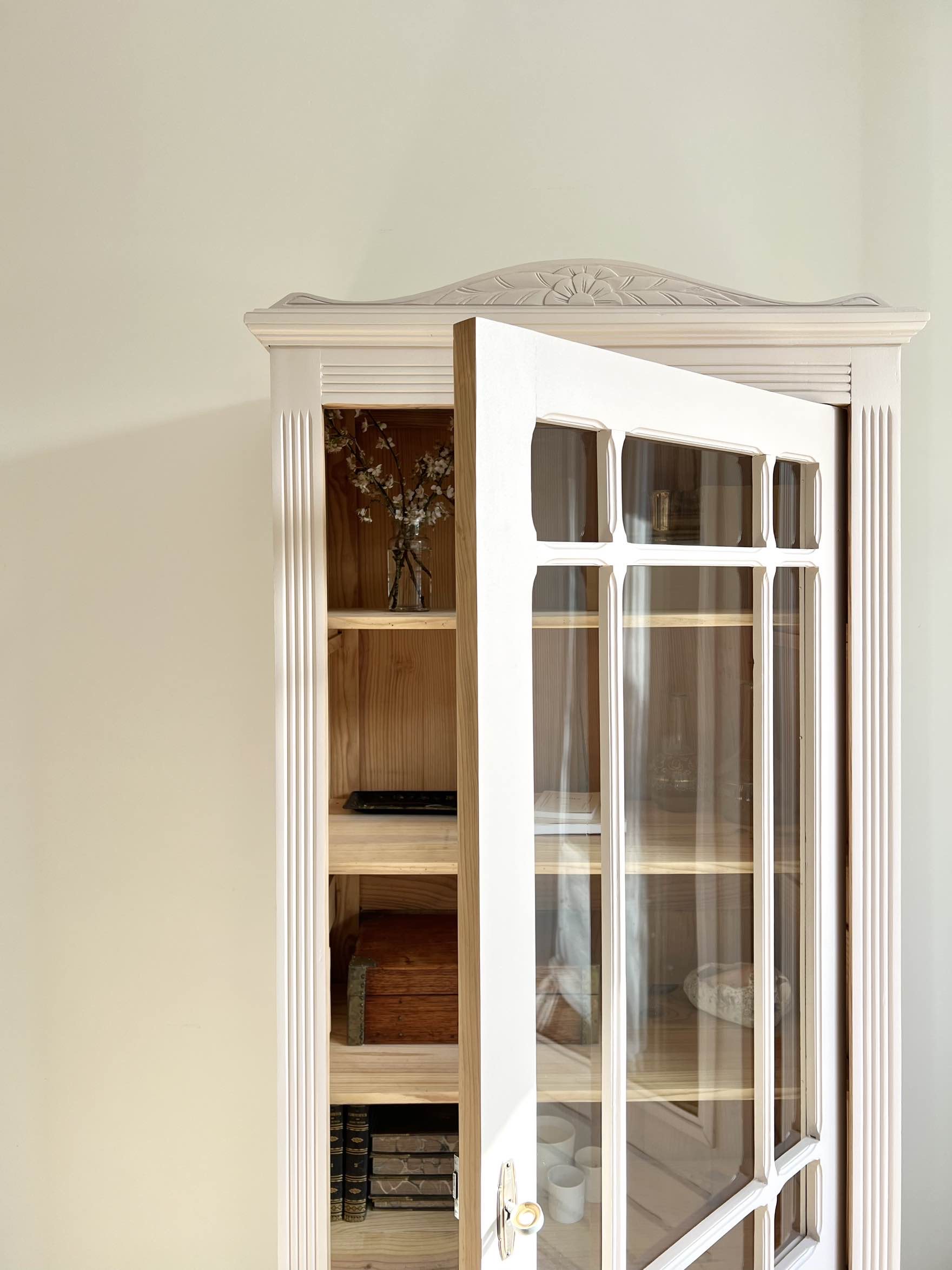 L’extérieur du meuble a été poncé et peint dans un beige chaud et enveloppant légèrement rosé, qui lui donne de l’éclat (peinture de qualité professionnelle Unikalo – gamme biosourcée Naé, finition satinée – protection par un vernis incolore).