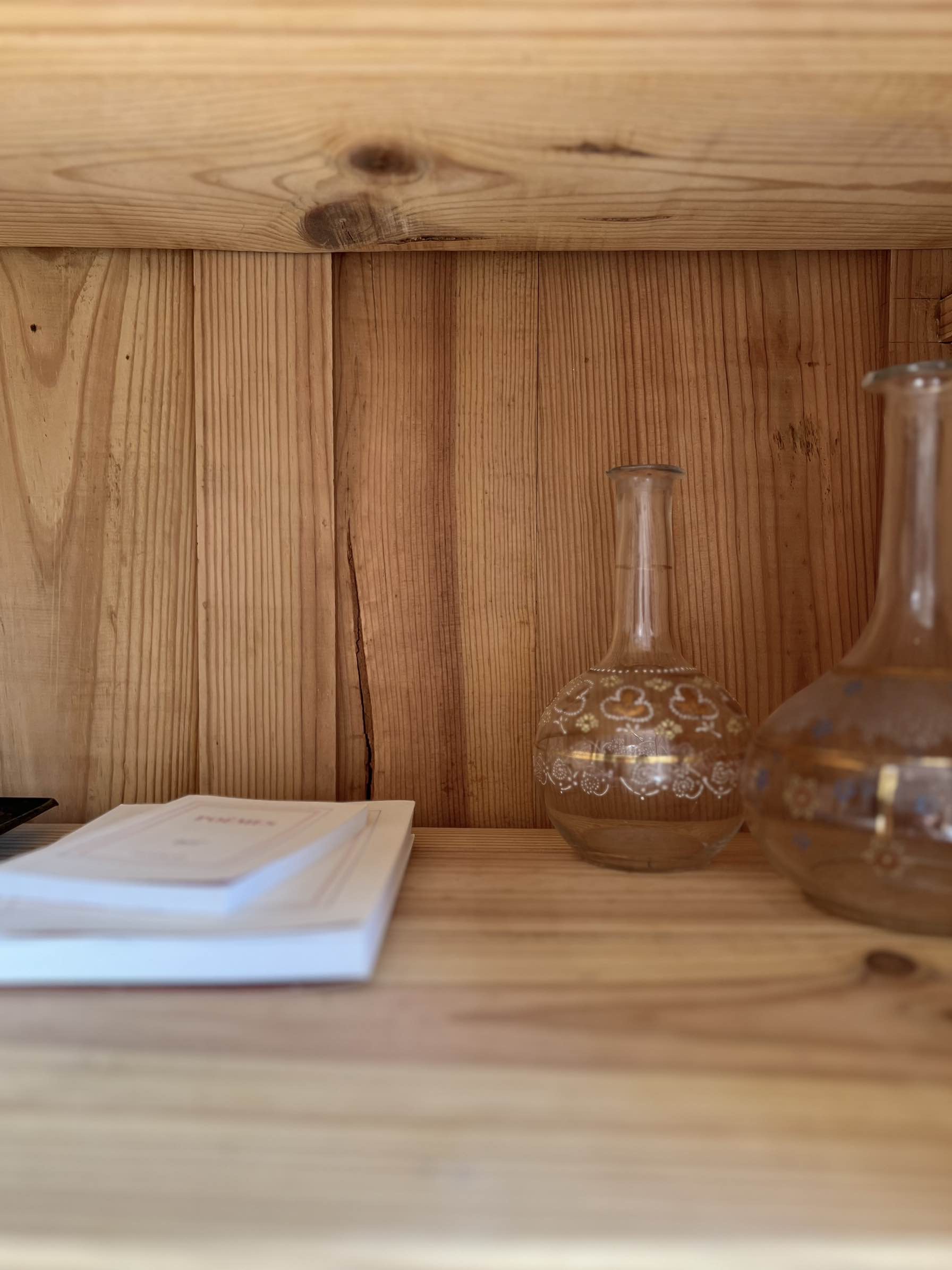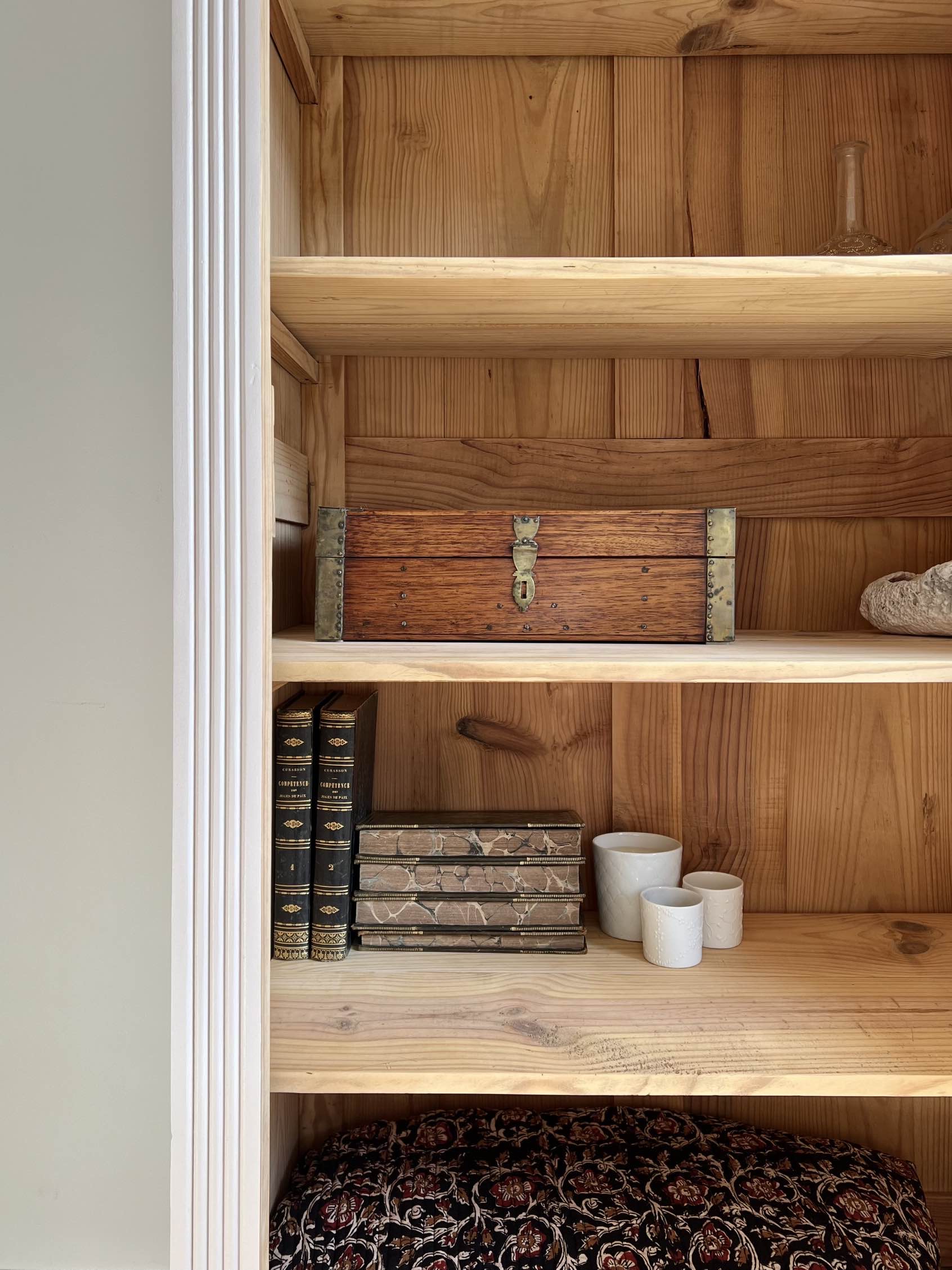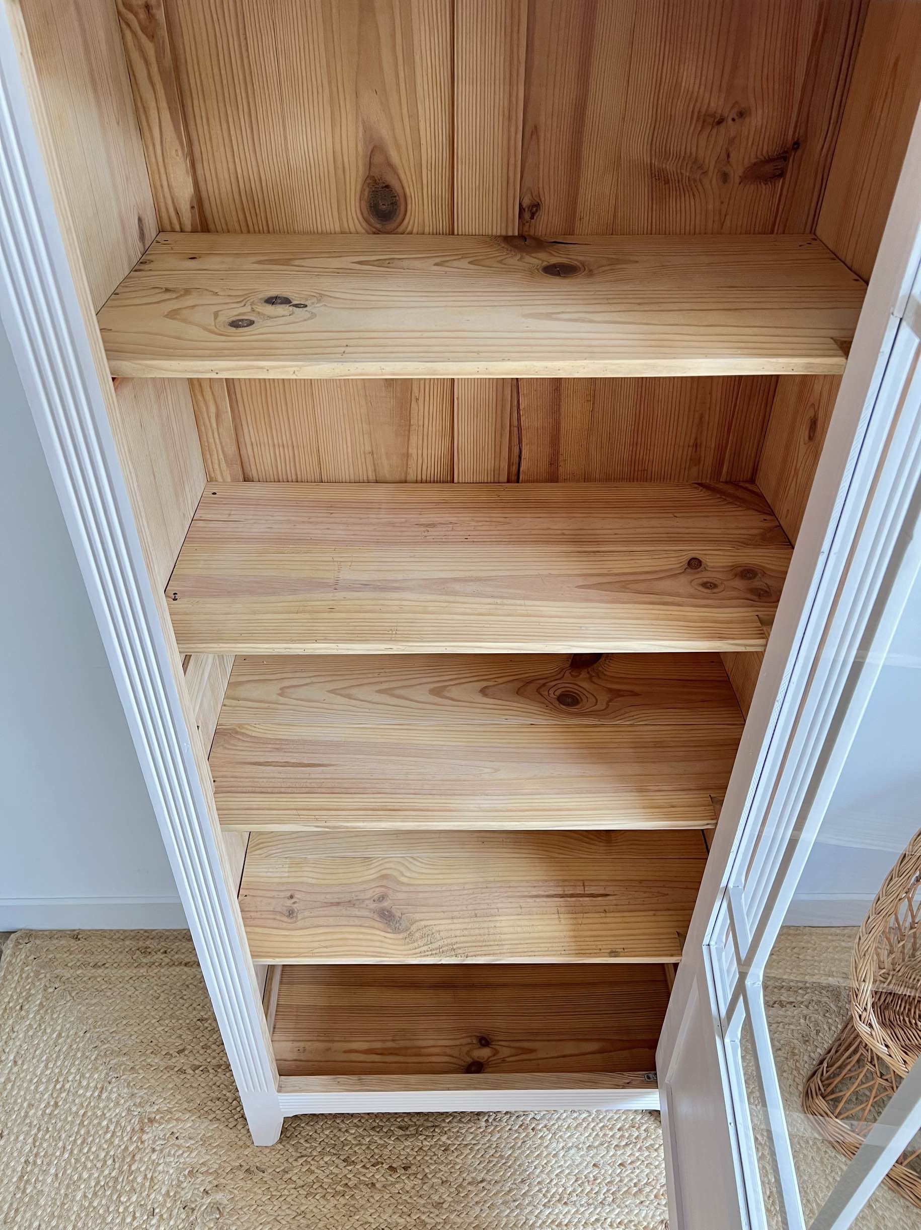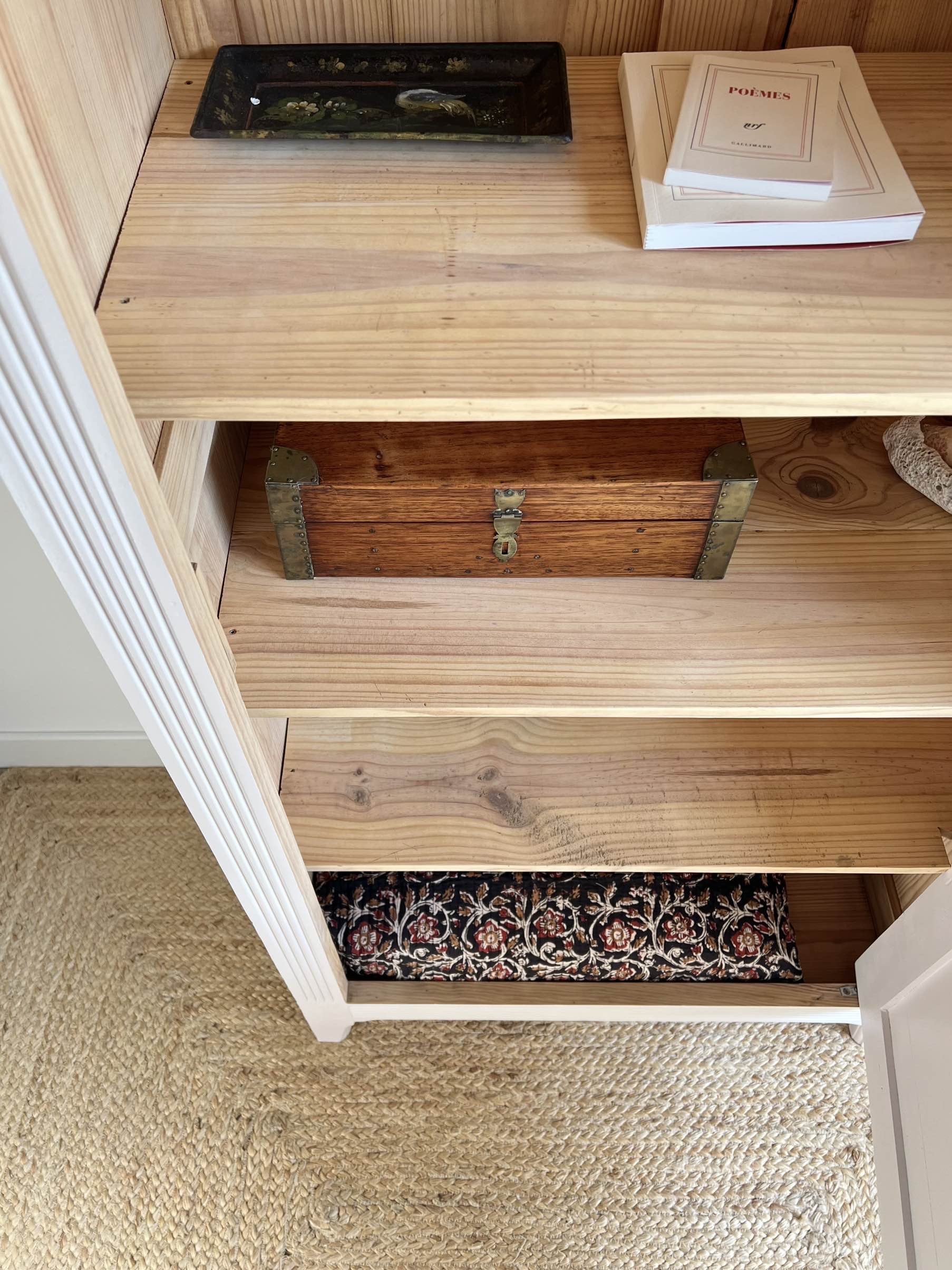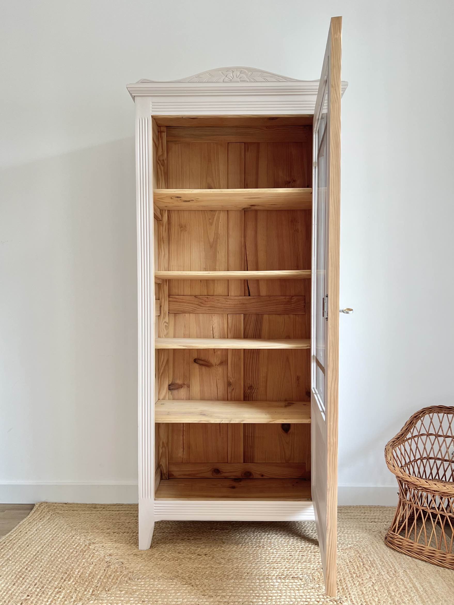 À l’intérieur, les quatre étagères d’origine fixes, ainsi que le corps du meuble ont été poncés, nettoyés et conservés en pin brut.