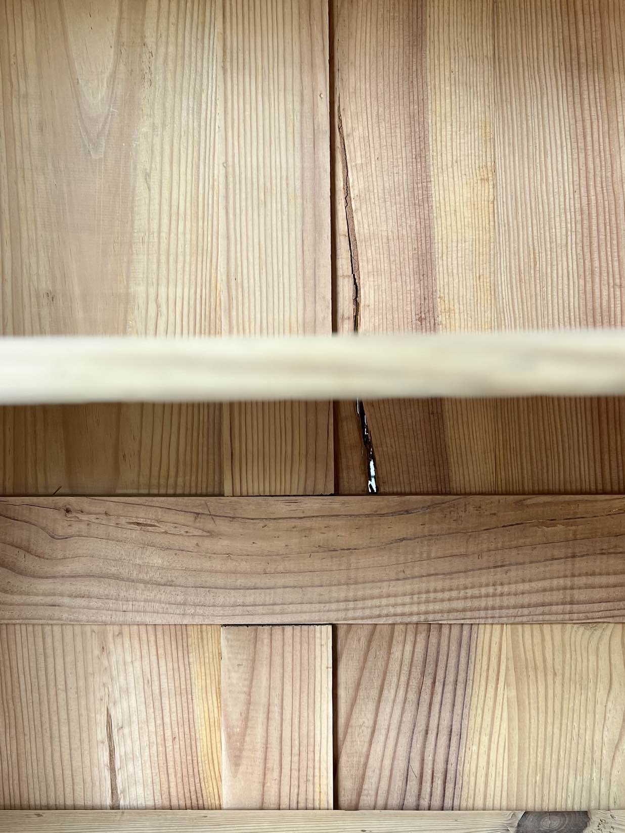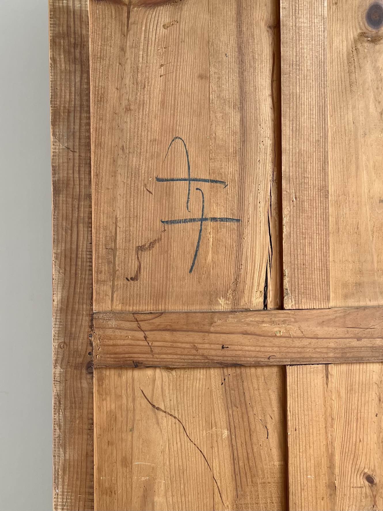 - L’angle inférieur de l’un des panneaux du fond du meuble s’est fendu avec le temps, ce qui n’affecte pas la solidité ou la stabilité du meuble (voir photographies).