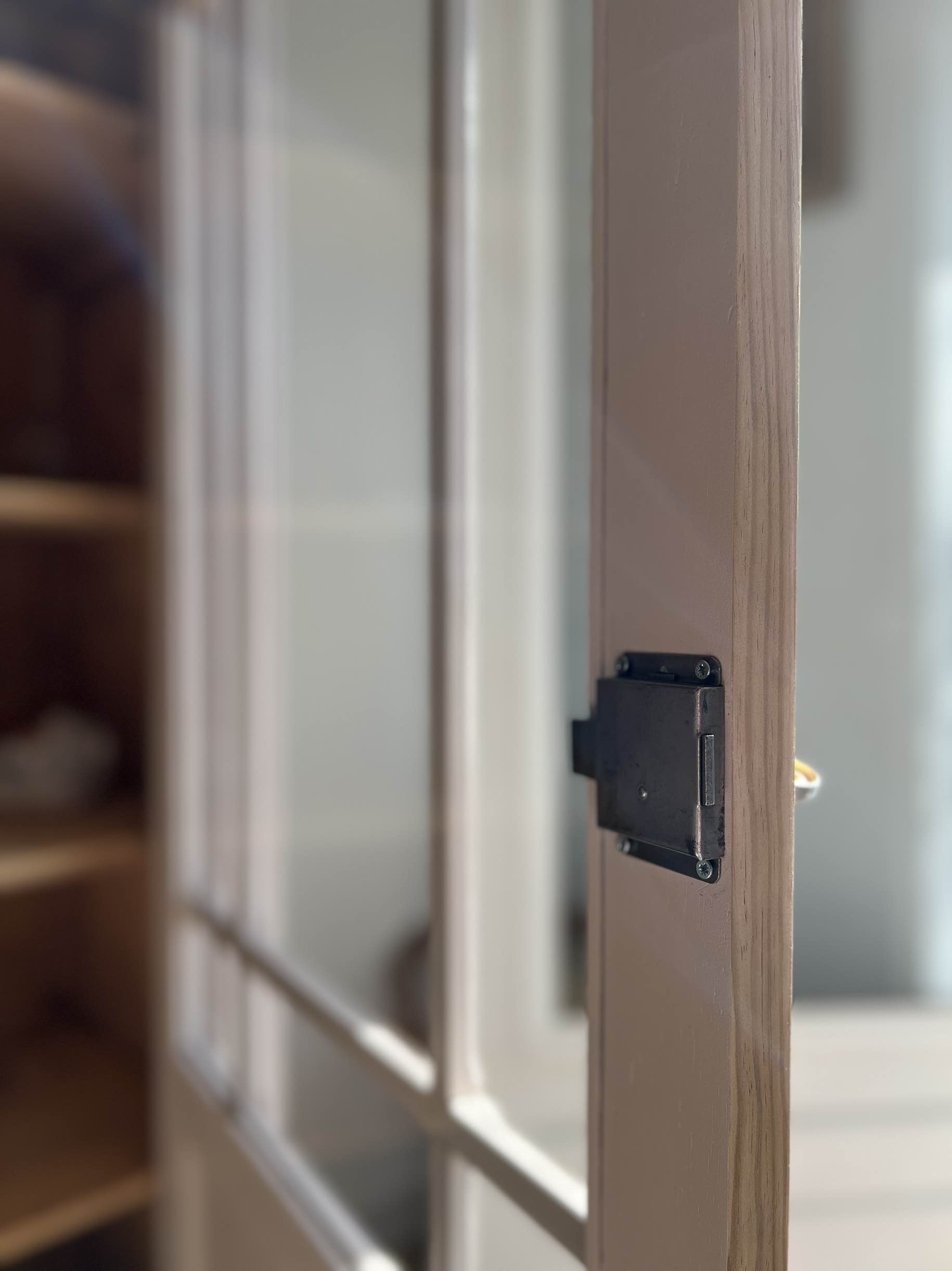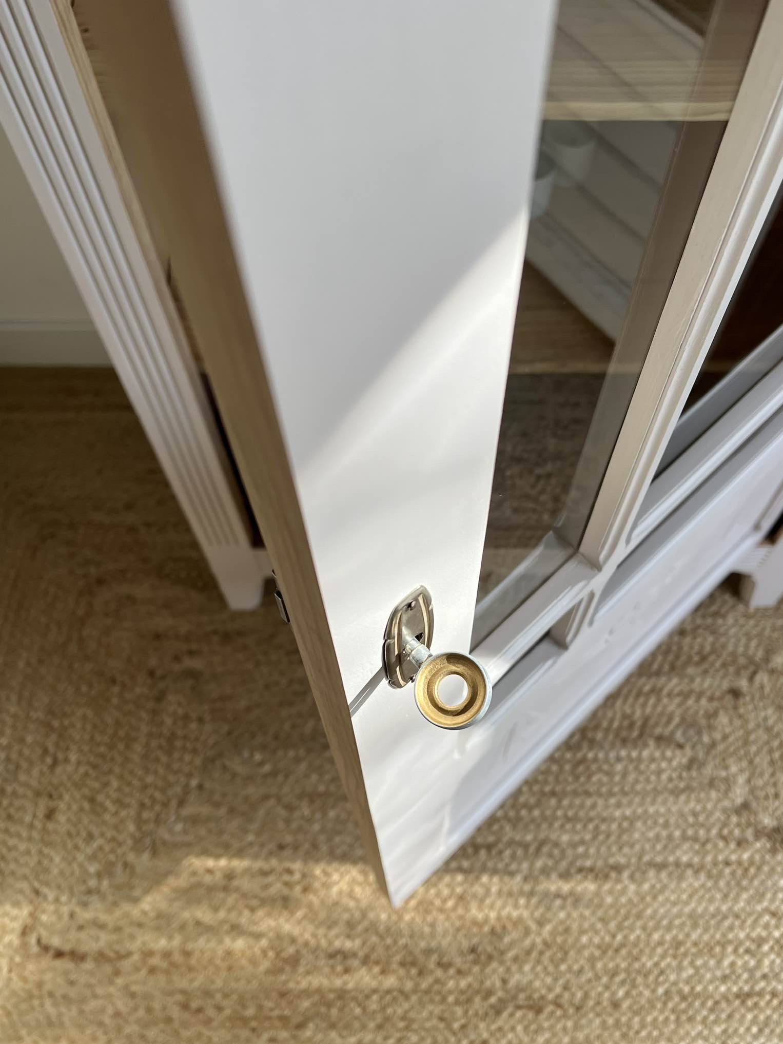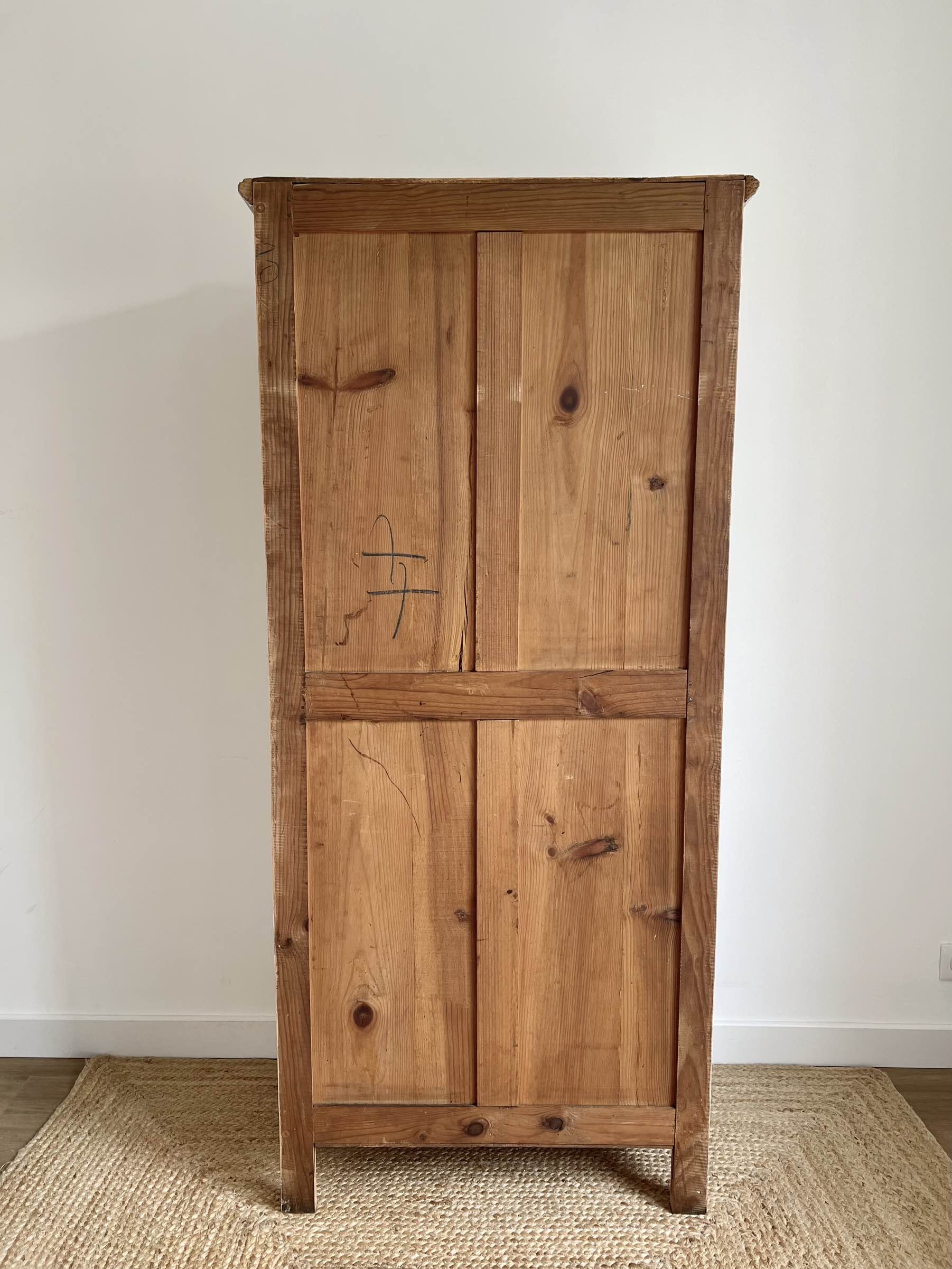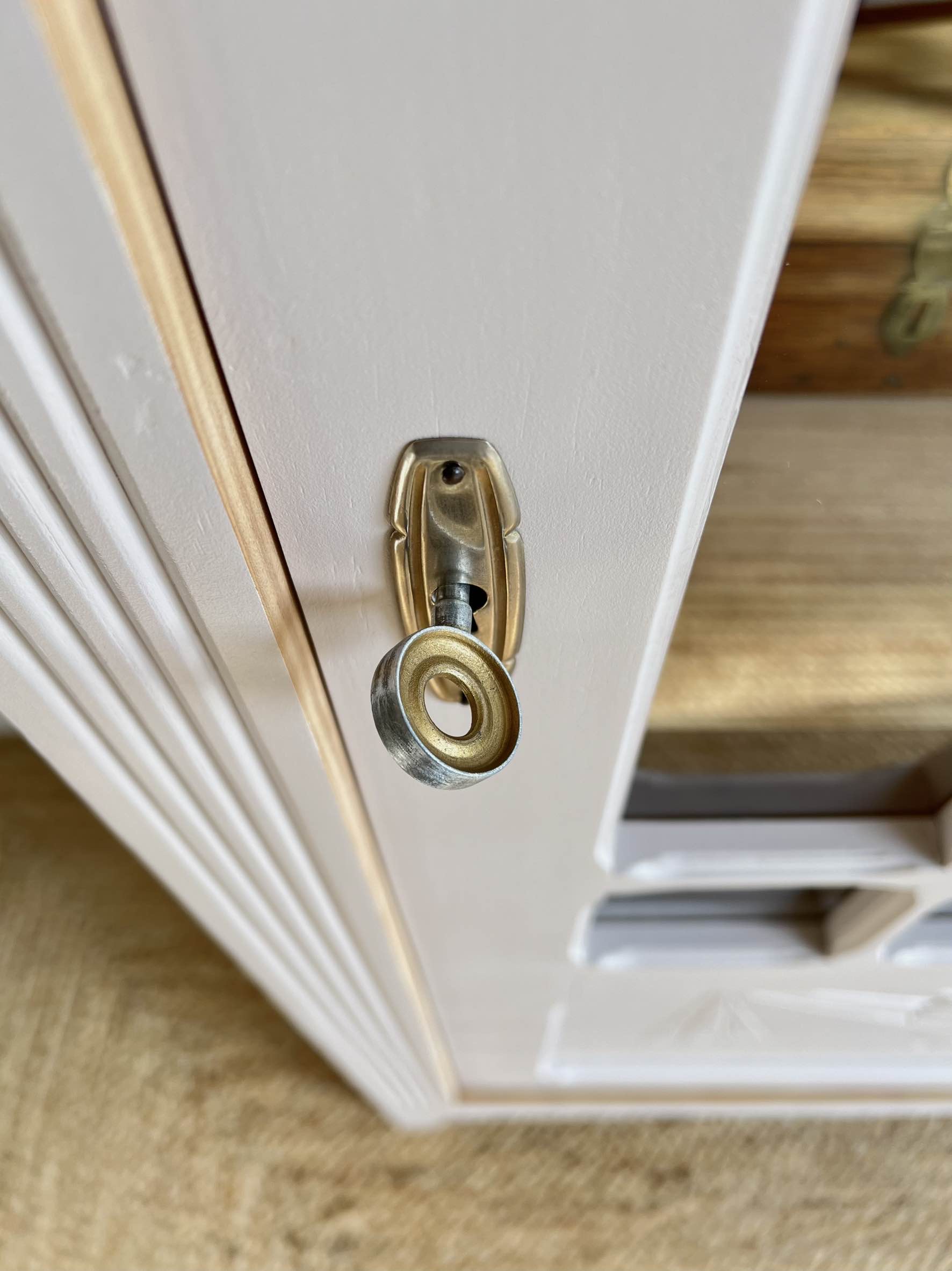 L’entrée de serrure est également d’origine. Le verrou manquant a été remplacé par un verrou et sa clé de la même époque que le meuble, qui ont été chinés.