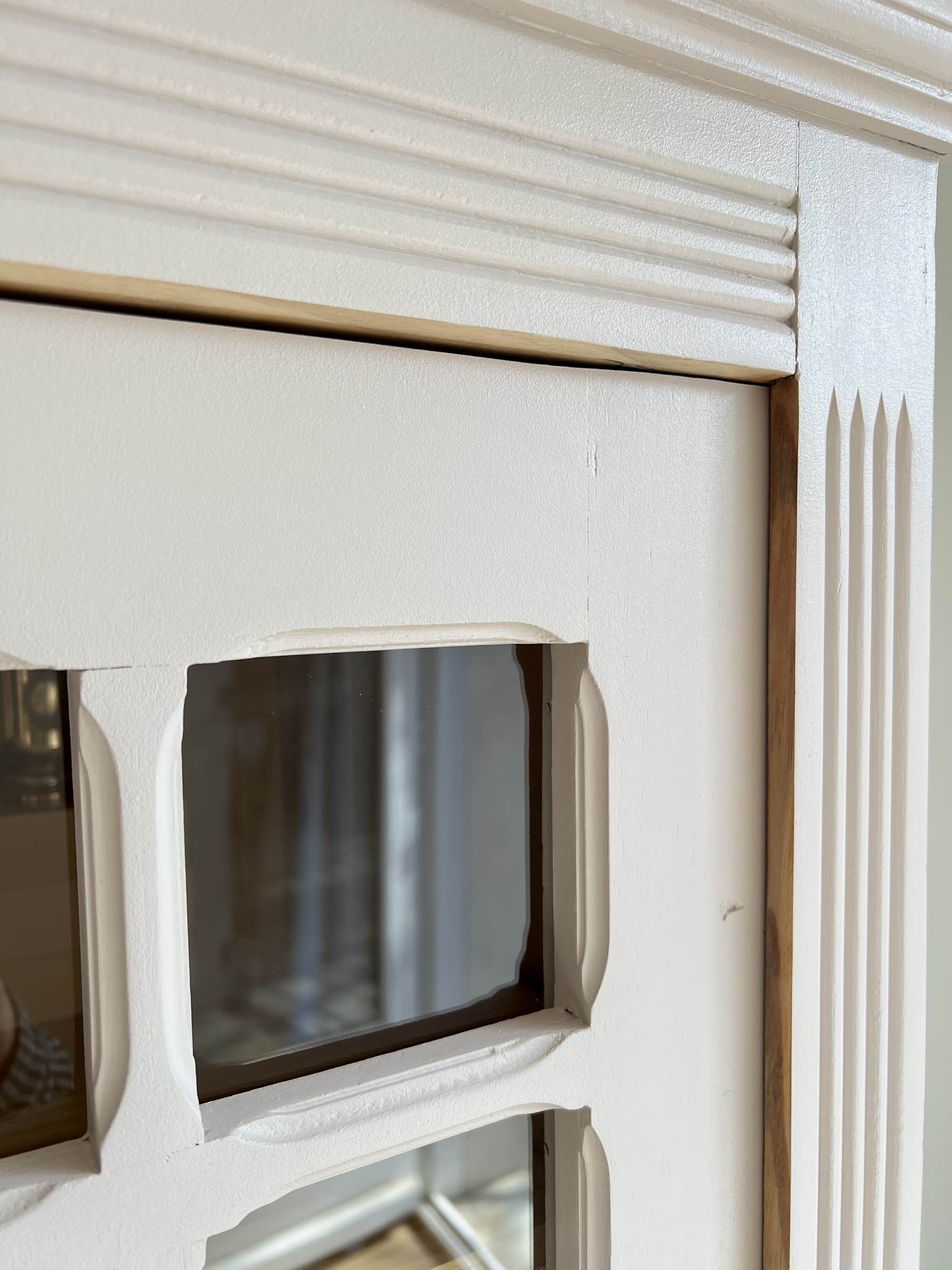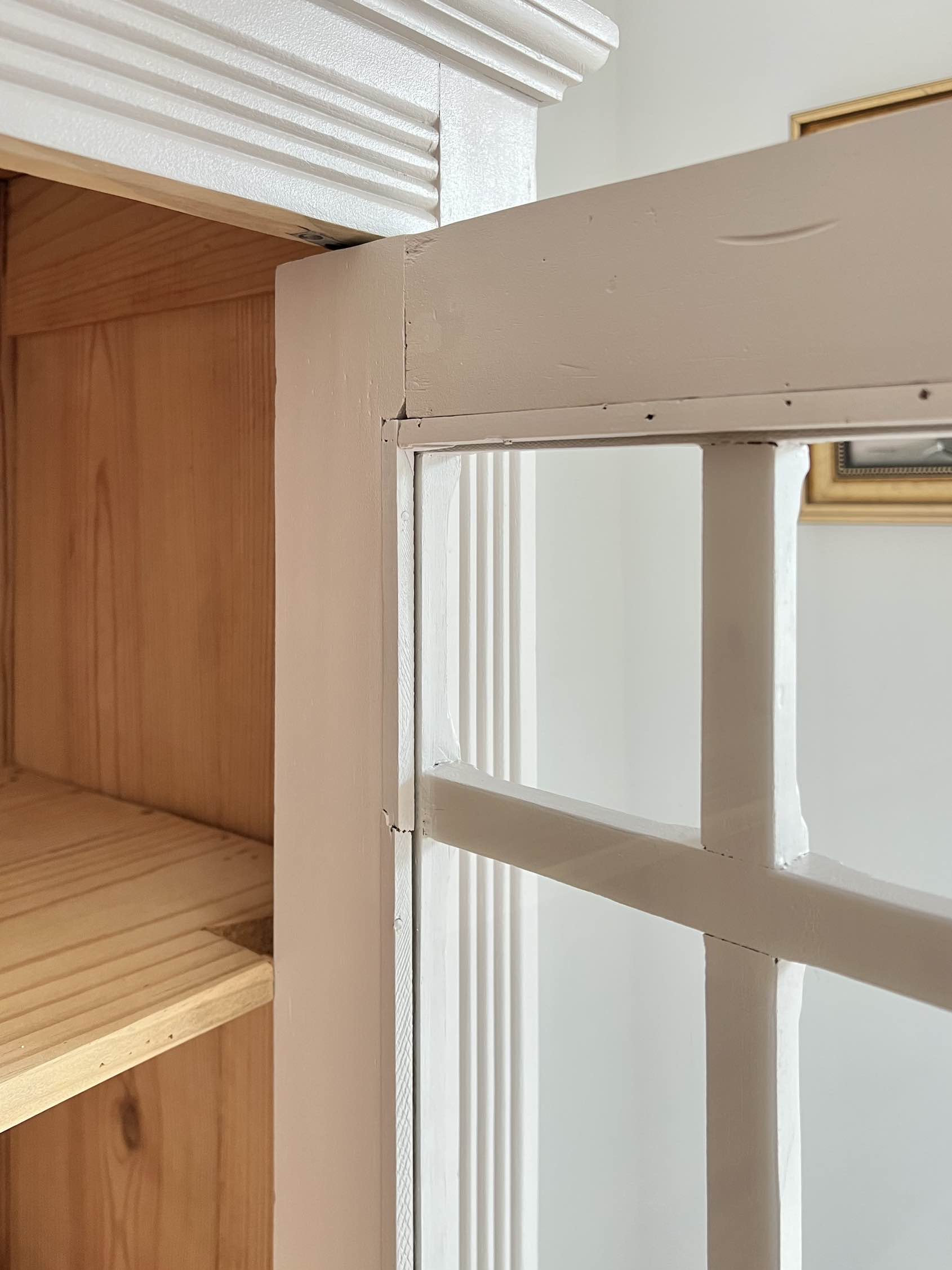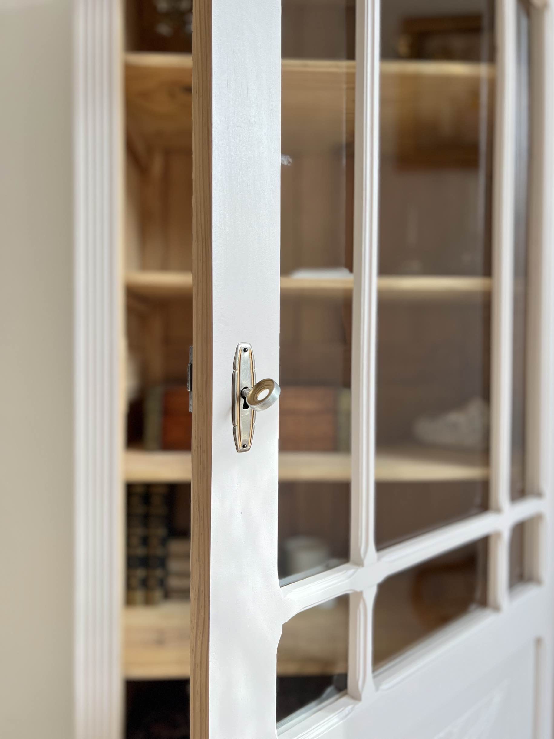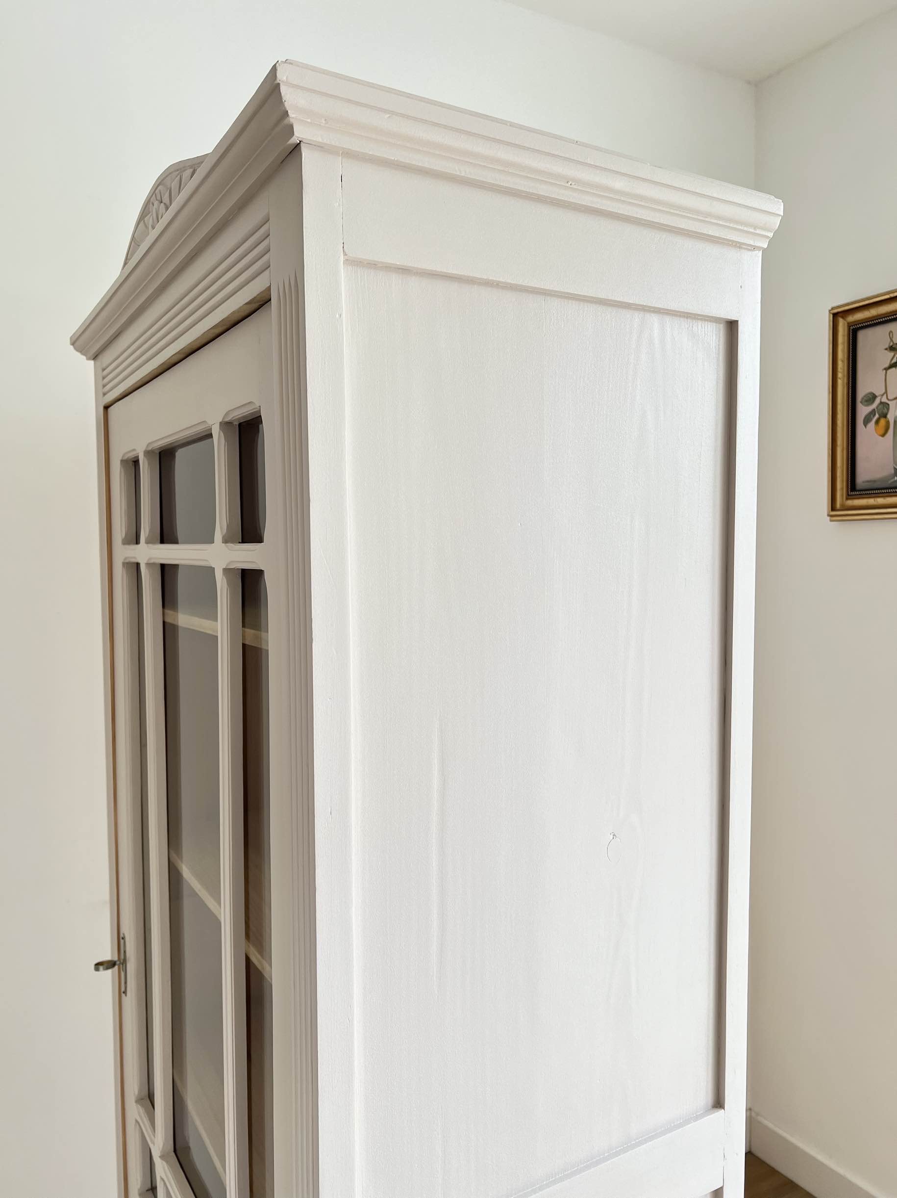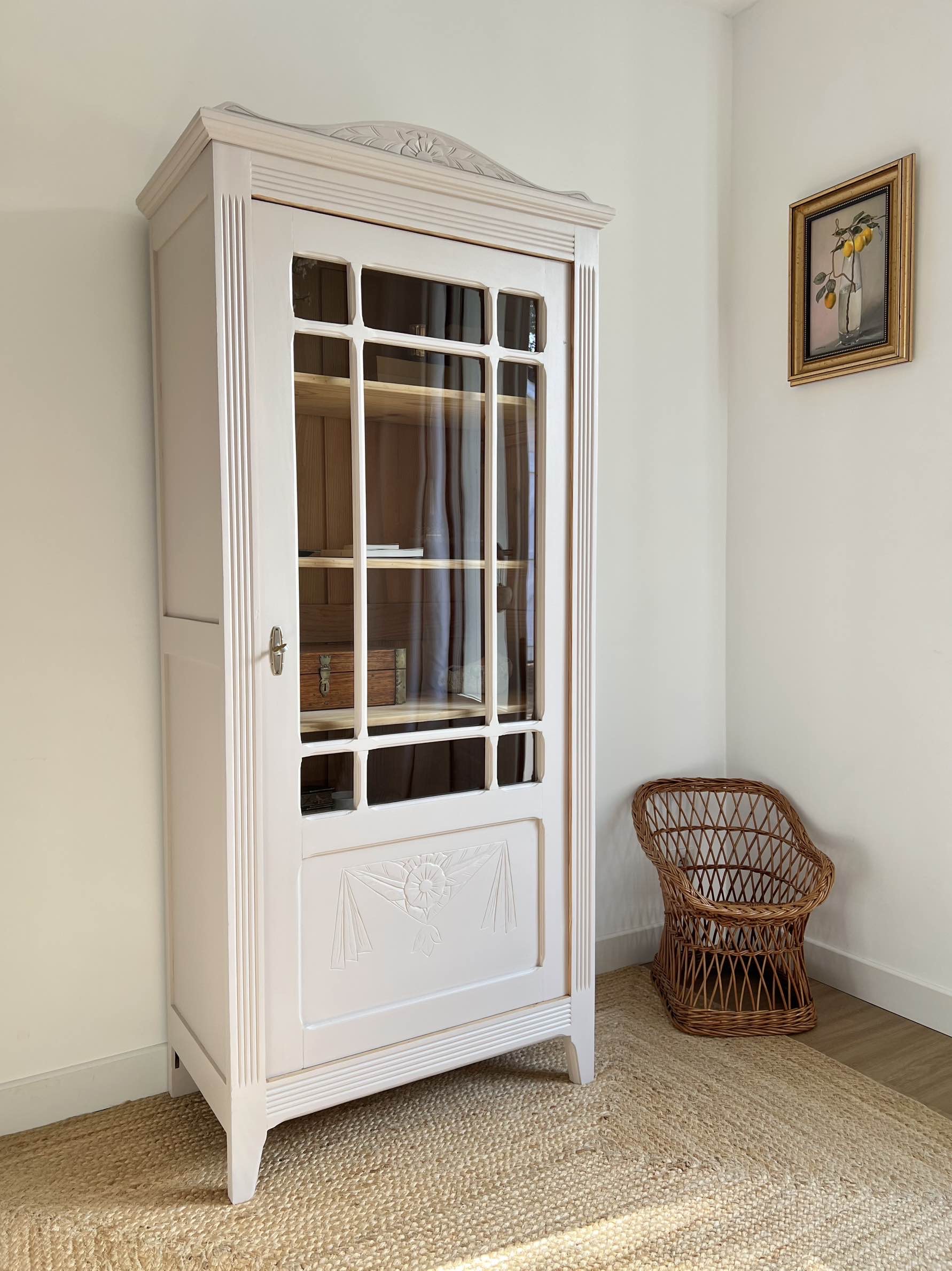 Elle possède une porte vitrée (vitre d’origine) avec des petits bois délicatement travaillés qui s’ouvre et se ferme sans difficulté.