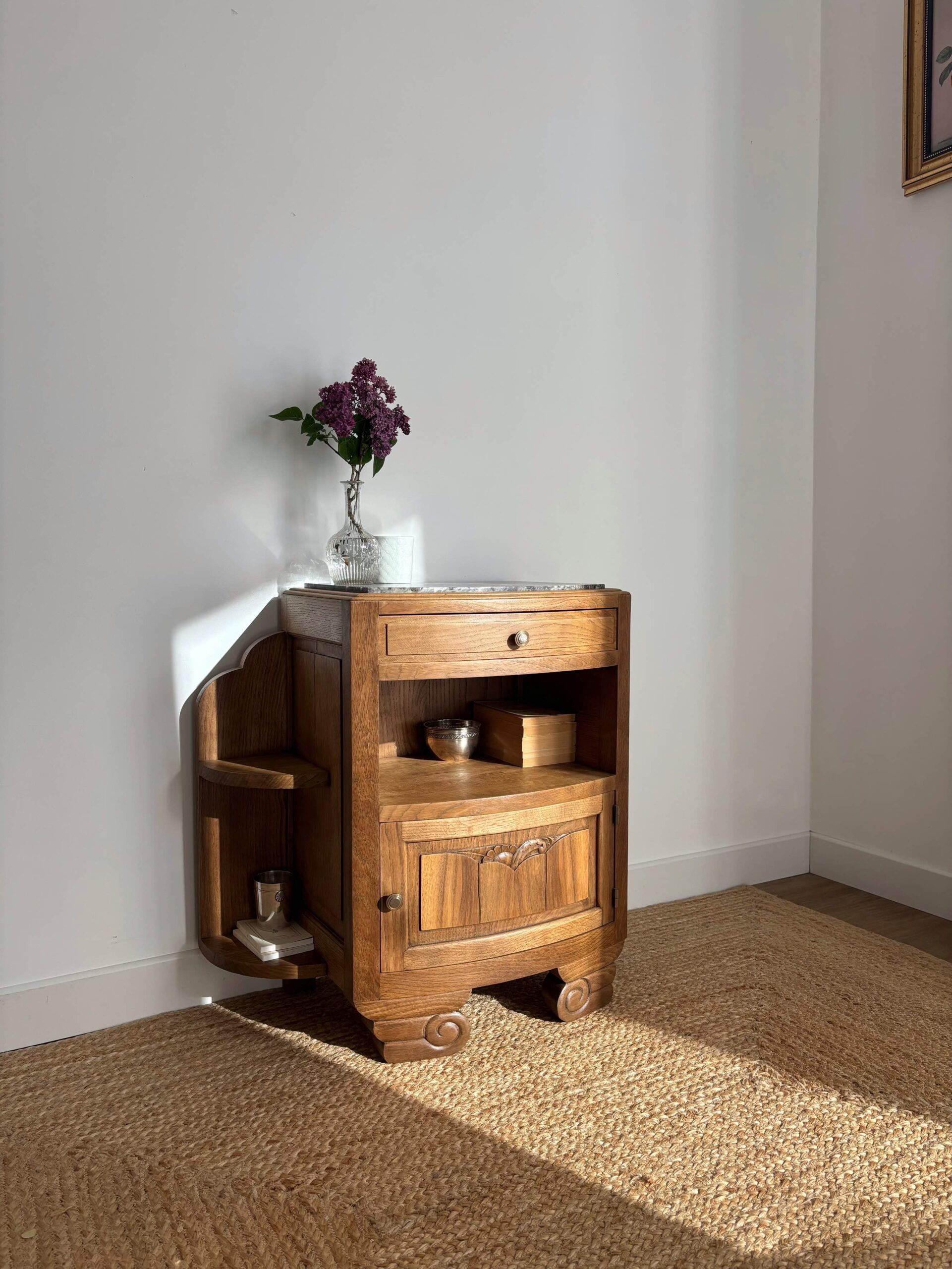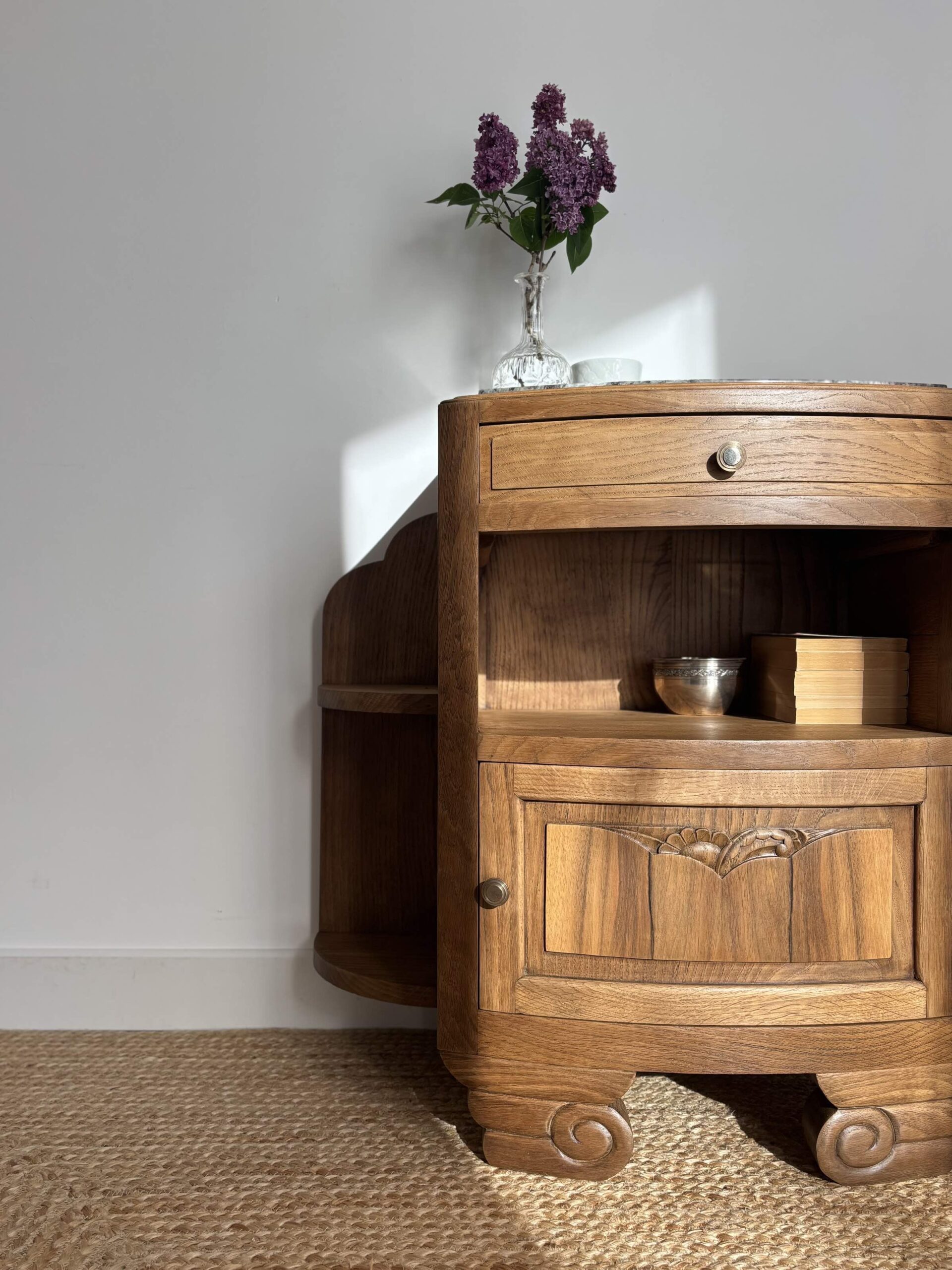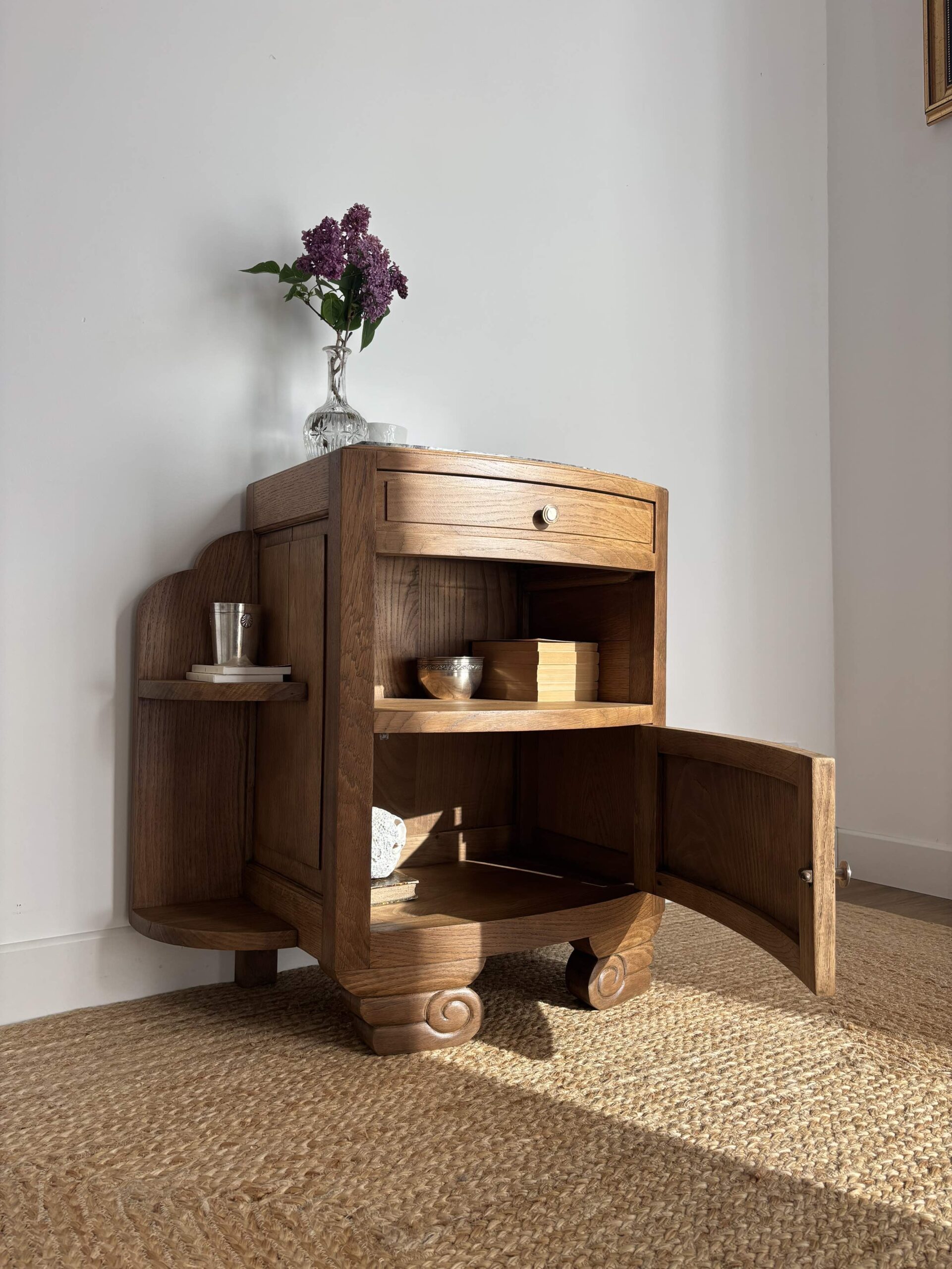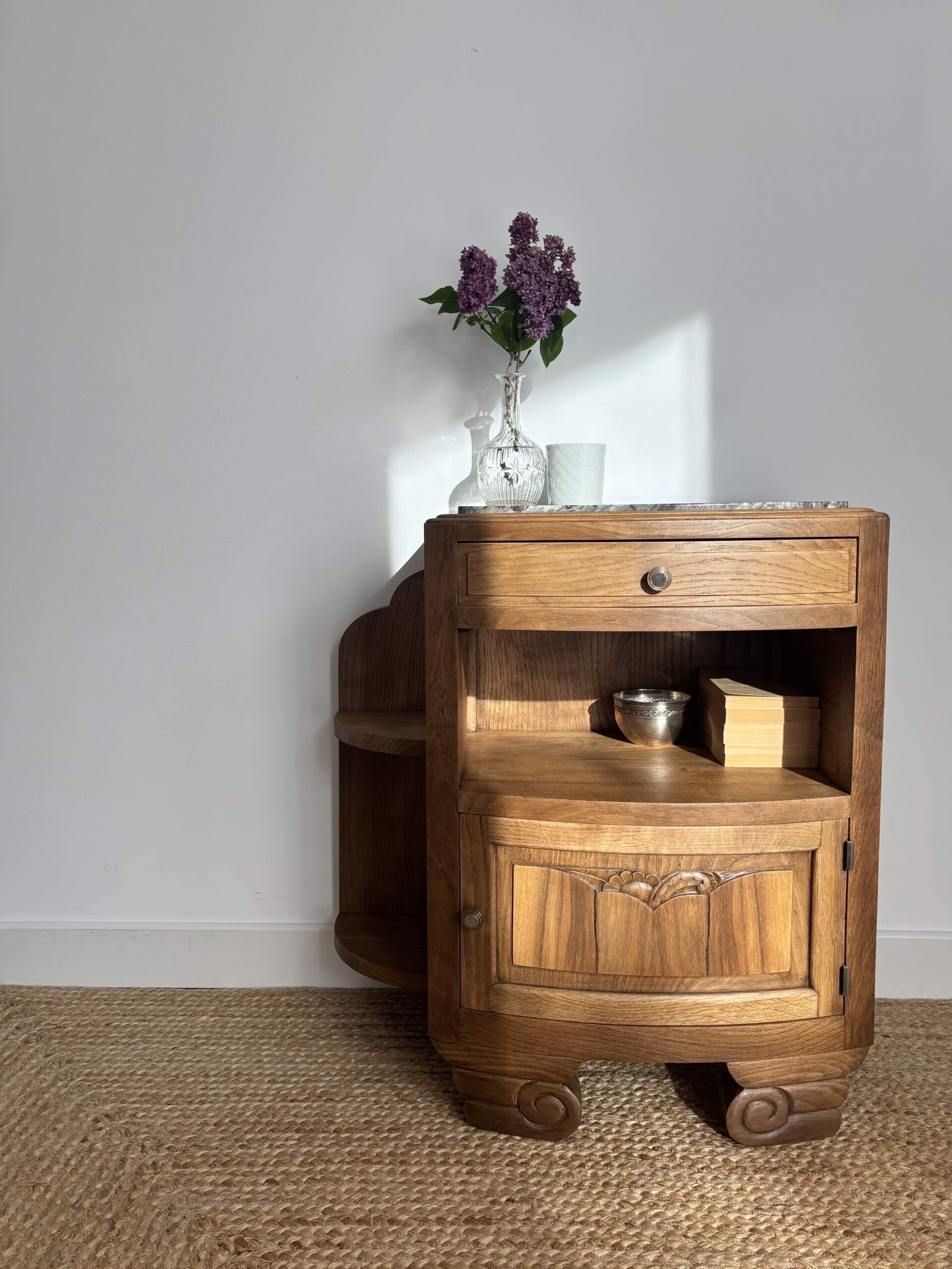 Voici une adorable pièce – meuble d’appoint ou de chevet – dans le plus pur style art-déco : pieds travaillés, porte ornée de motifs fleuris sculptés dans le bois, alternance de lignes droites et arrondies.