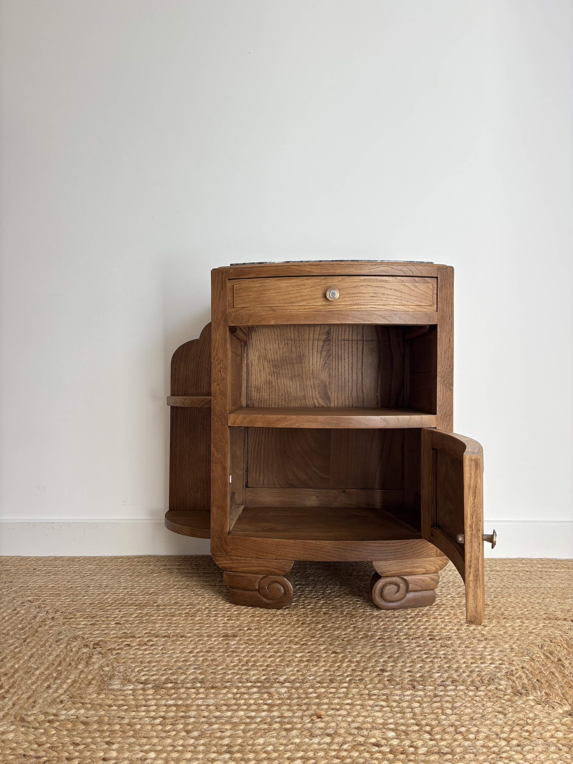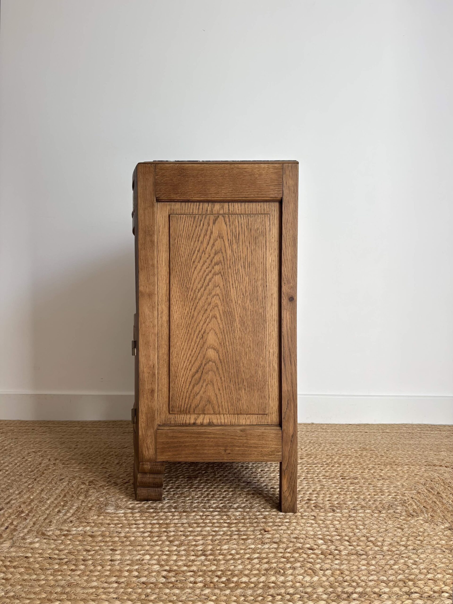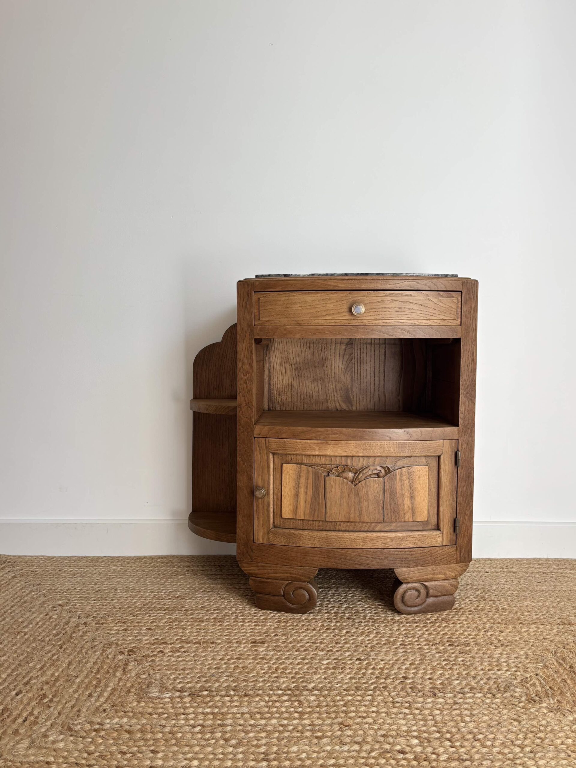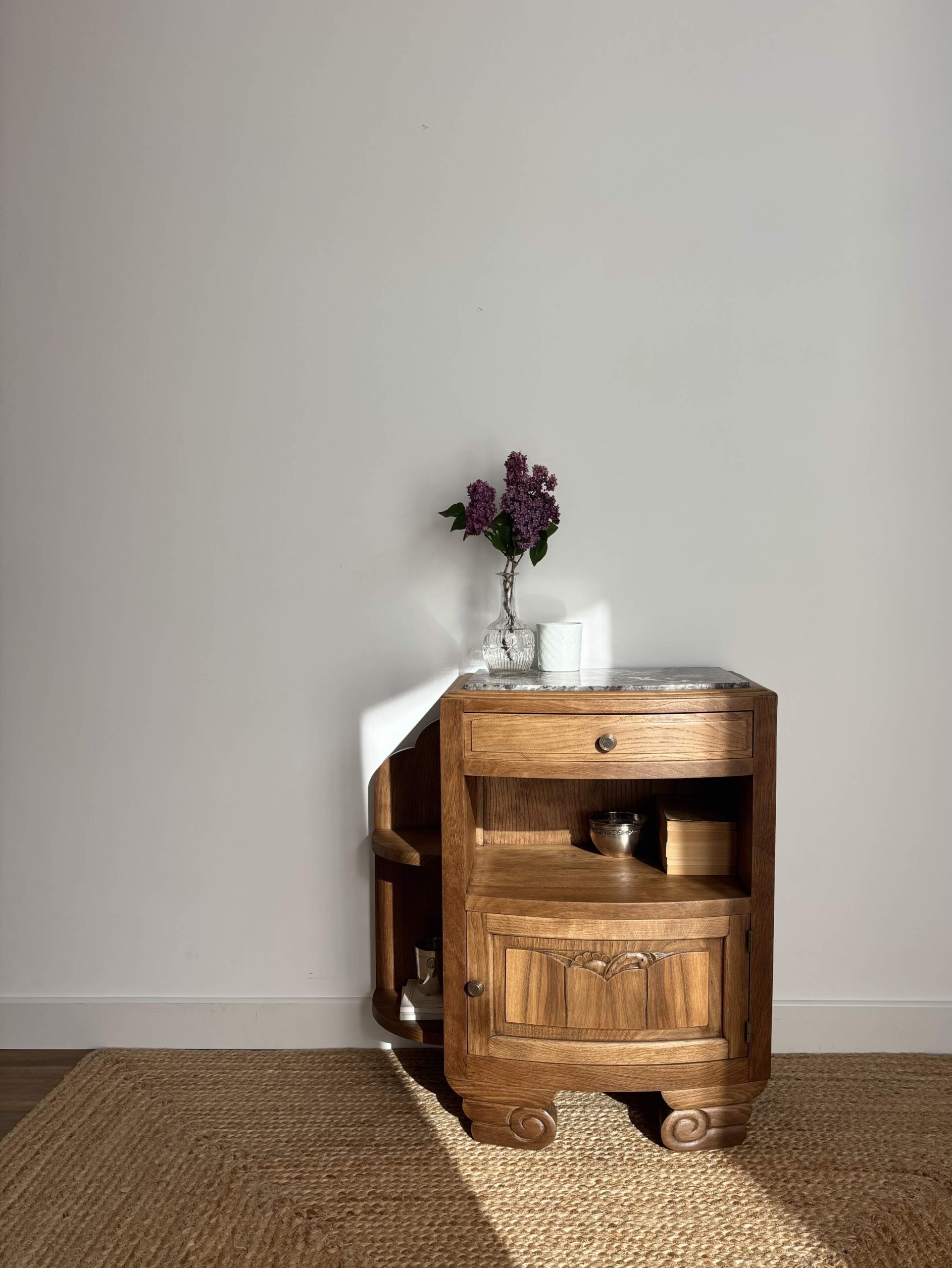 Voici une adorable pièce – meuble d’appoint ou de chevet – dans le plus pur style art-déco : pieds travaillés, porte ornée de motifs fleuris sculptés dans le bois, alternance de lignes droites et arrondies.