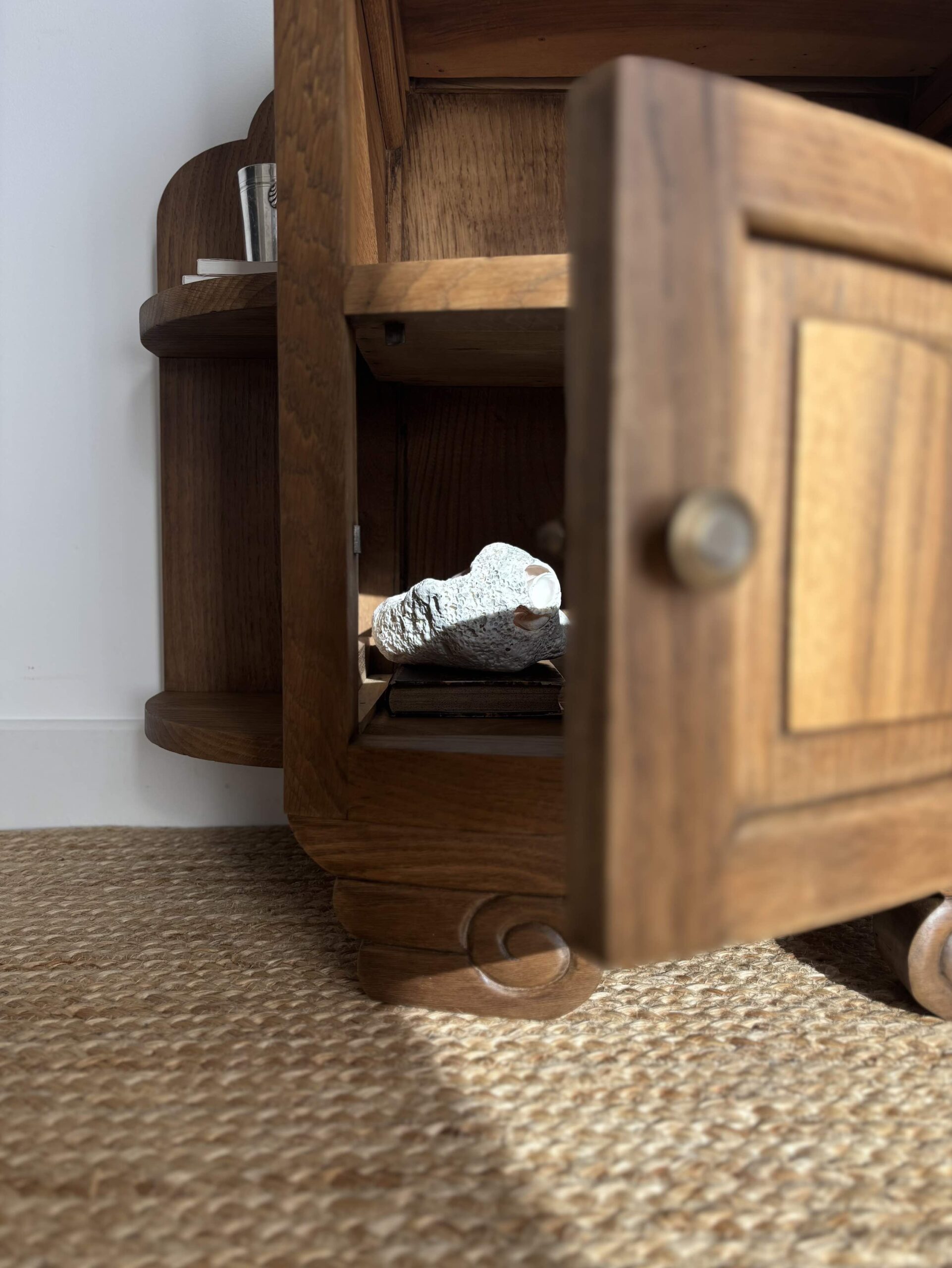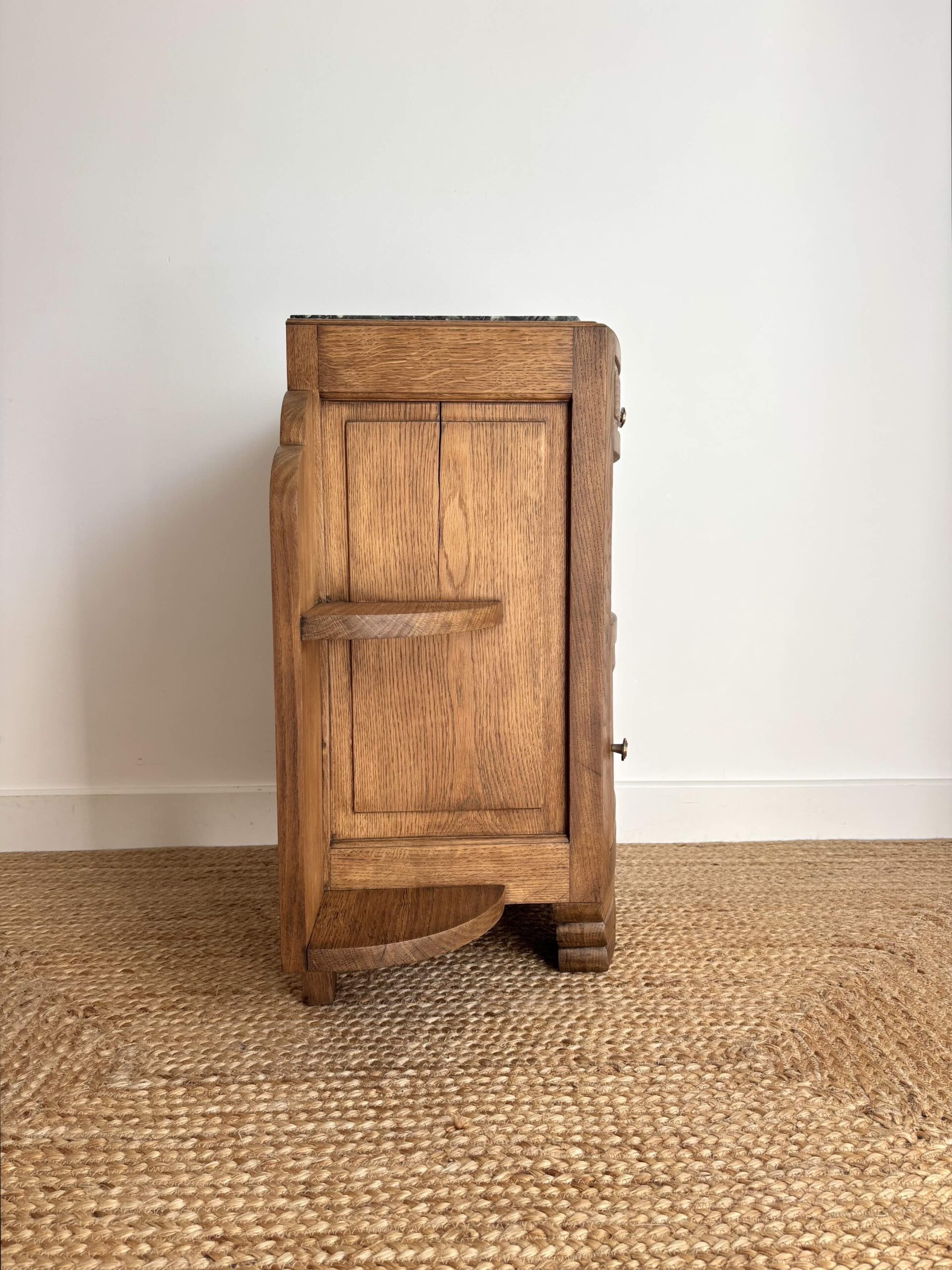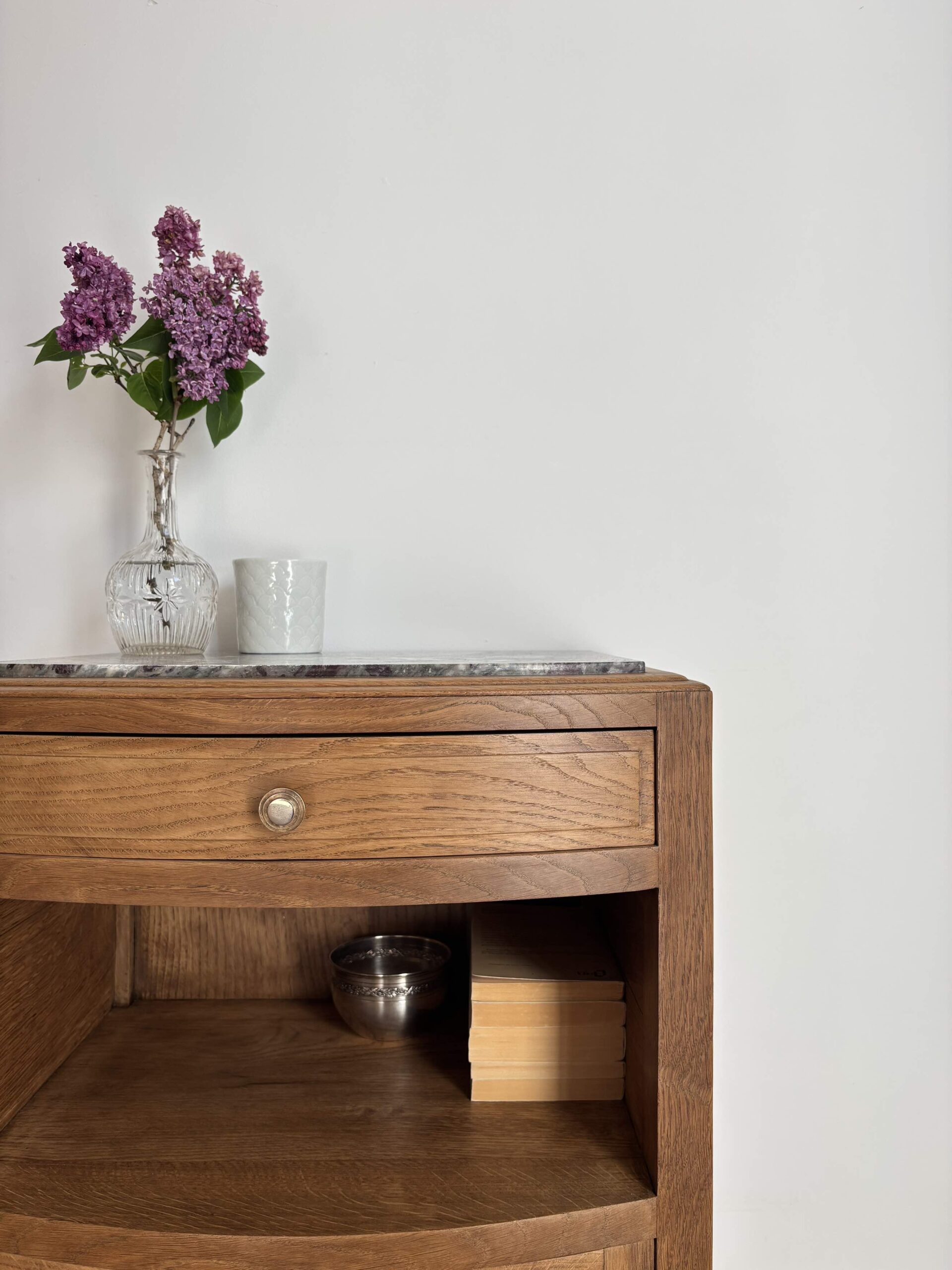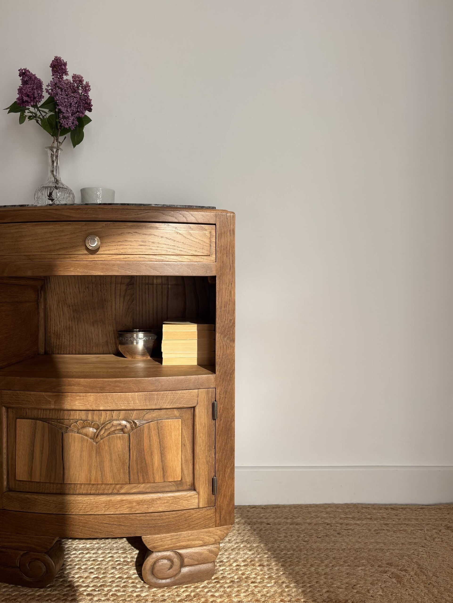 Voici une adorable pièce – meuble d’appoint ou de chevet – dans le plus pur style art-déco : pieds travaillés, porte ornée de motifs fleuris sculptés dans le bois, alternance de lignes droites et arrondies.