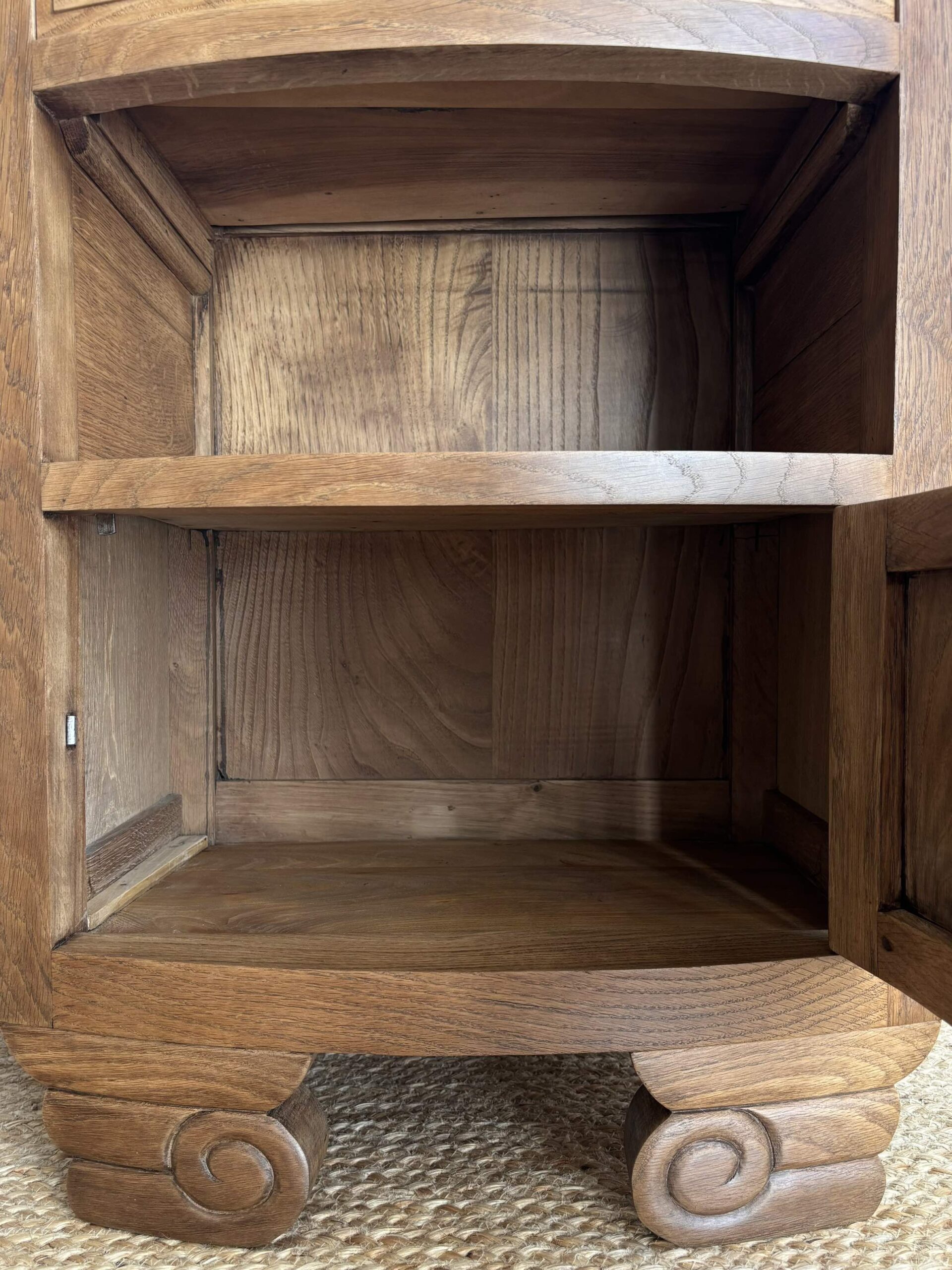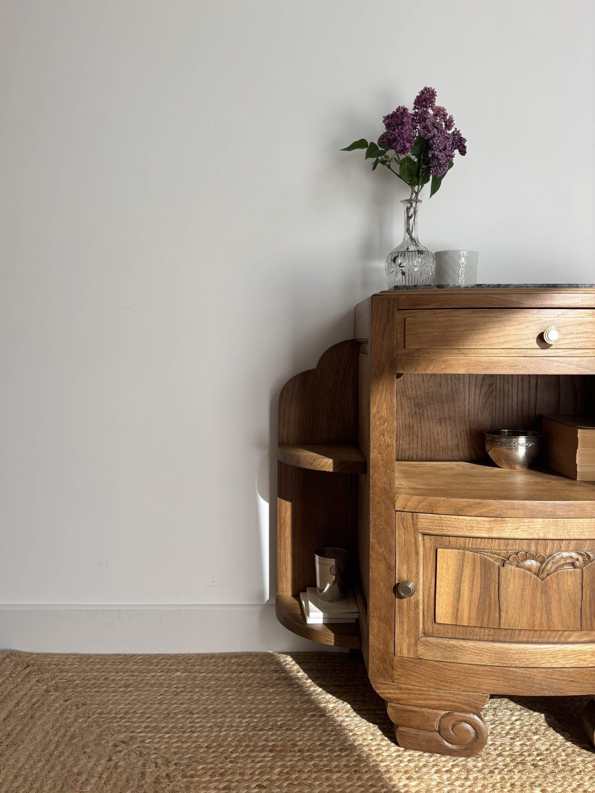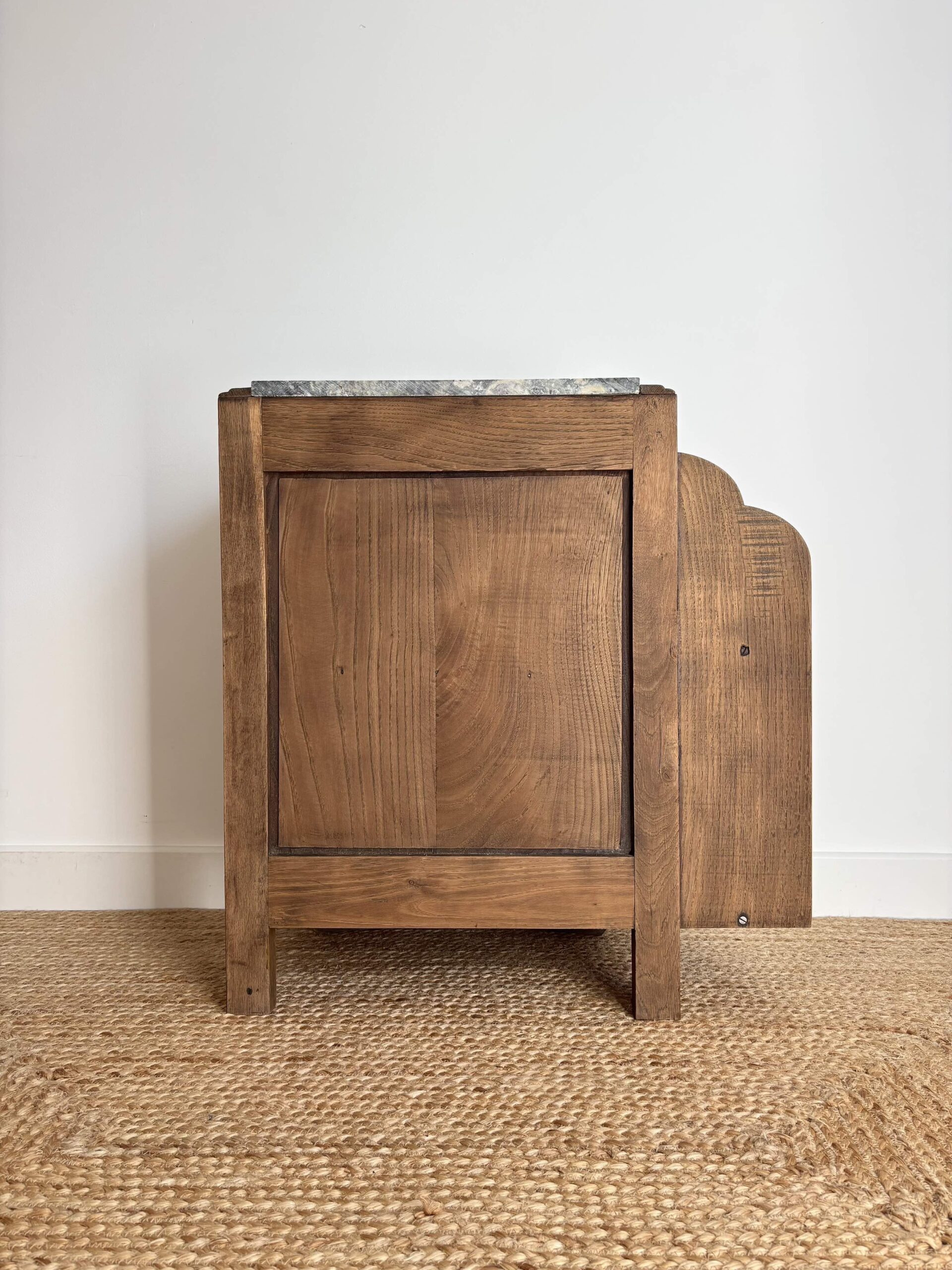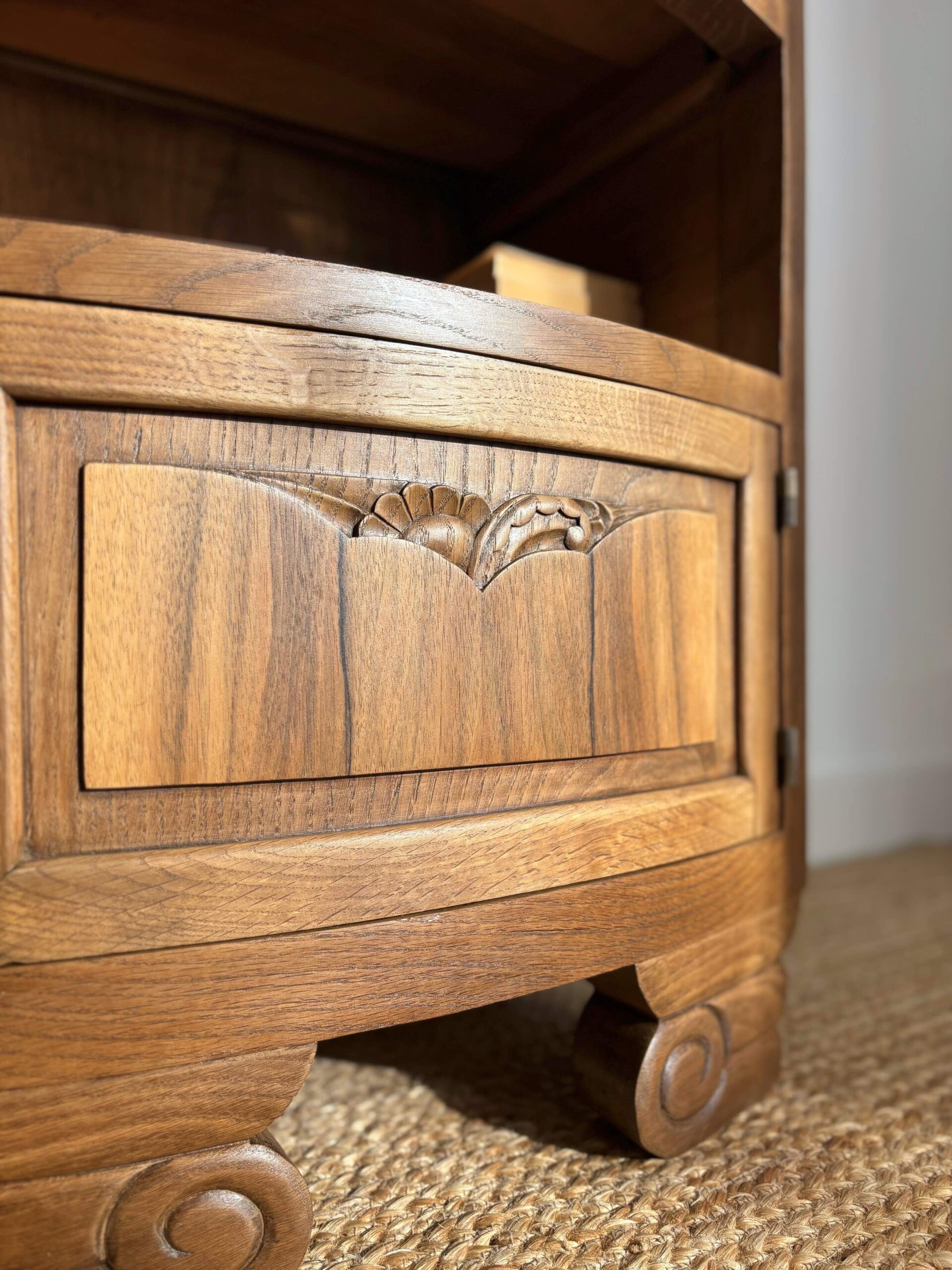 Voici une adorable pièce – meuble d’appoint ou de chevet – dans le plus pur style art-déco : pieds travaillés, porte ornée de motifs fleuris sculptés dans le bois, alternance de lignes droites et arrondies.