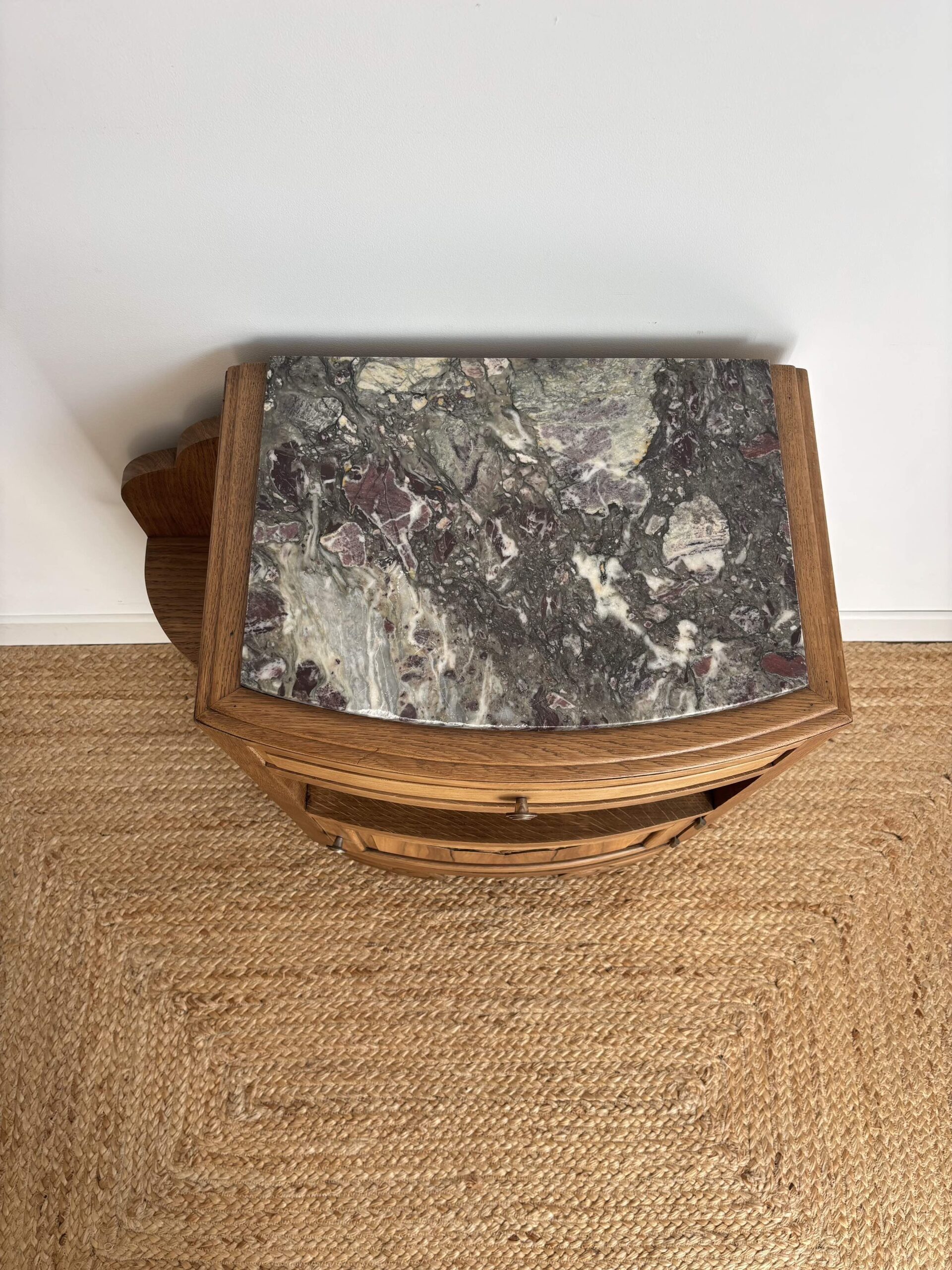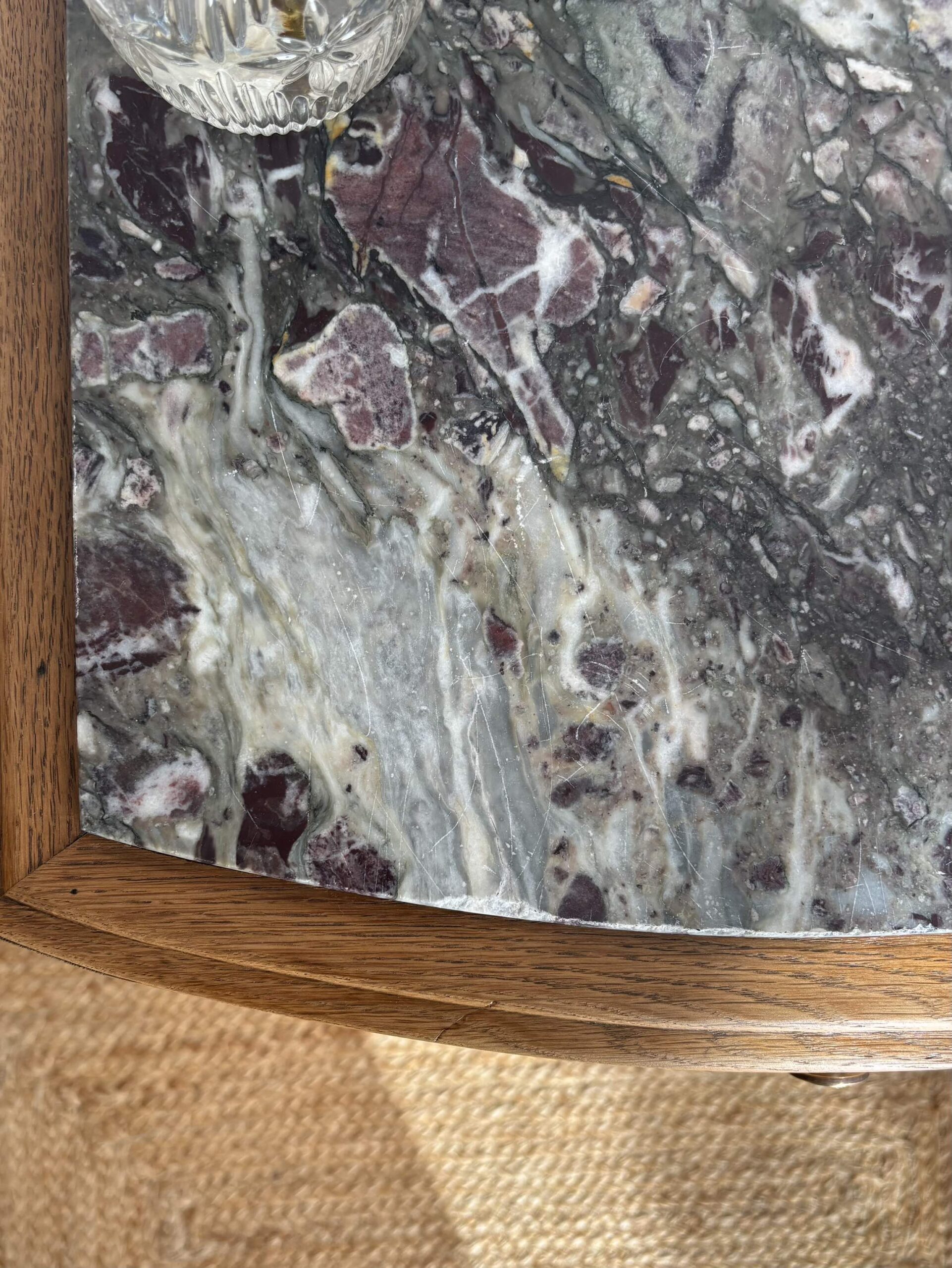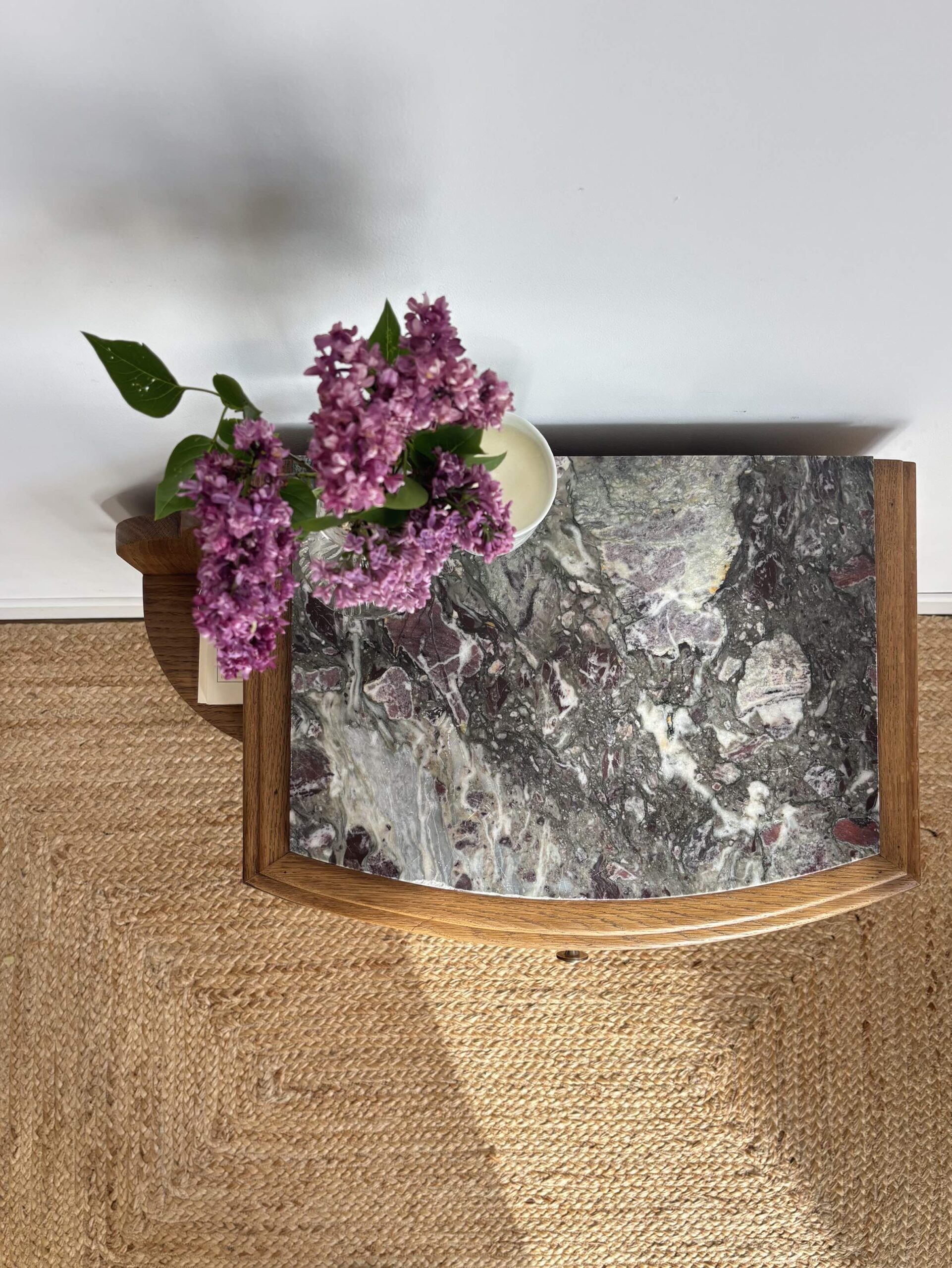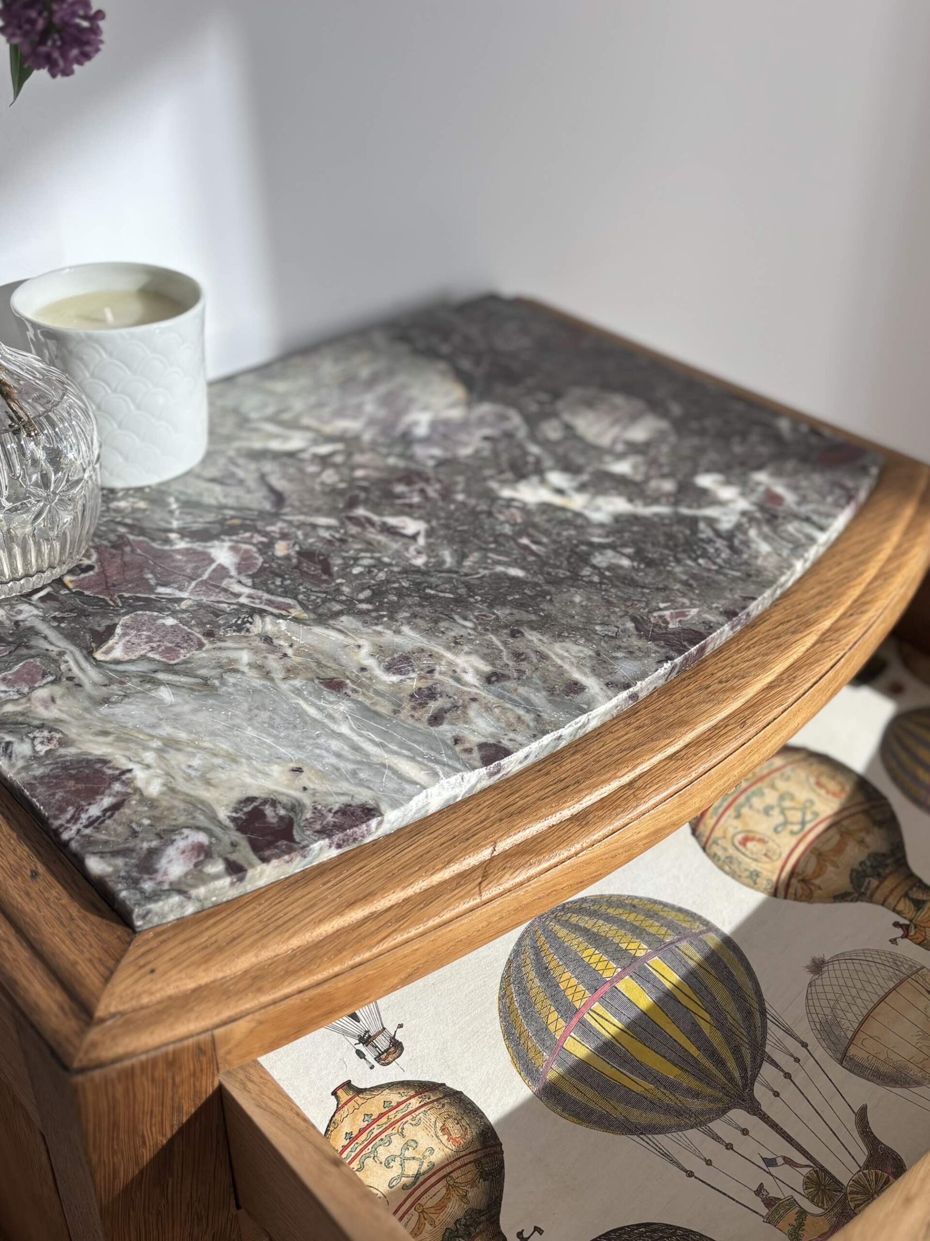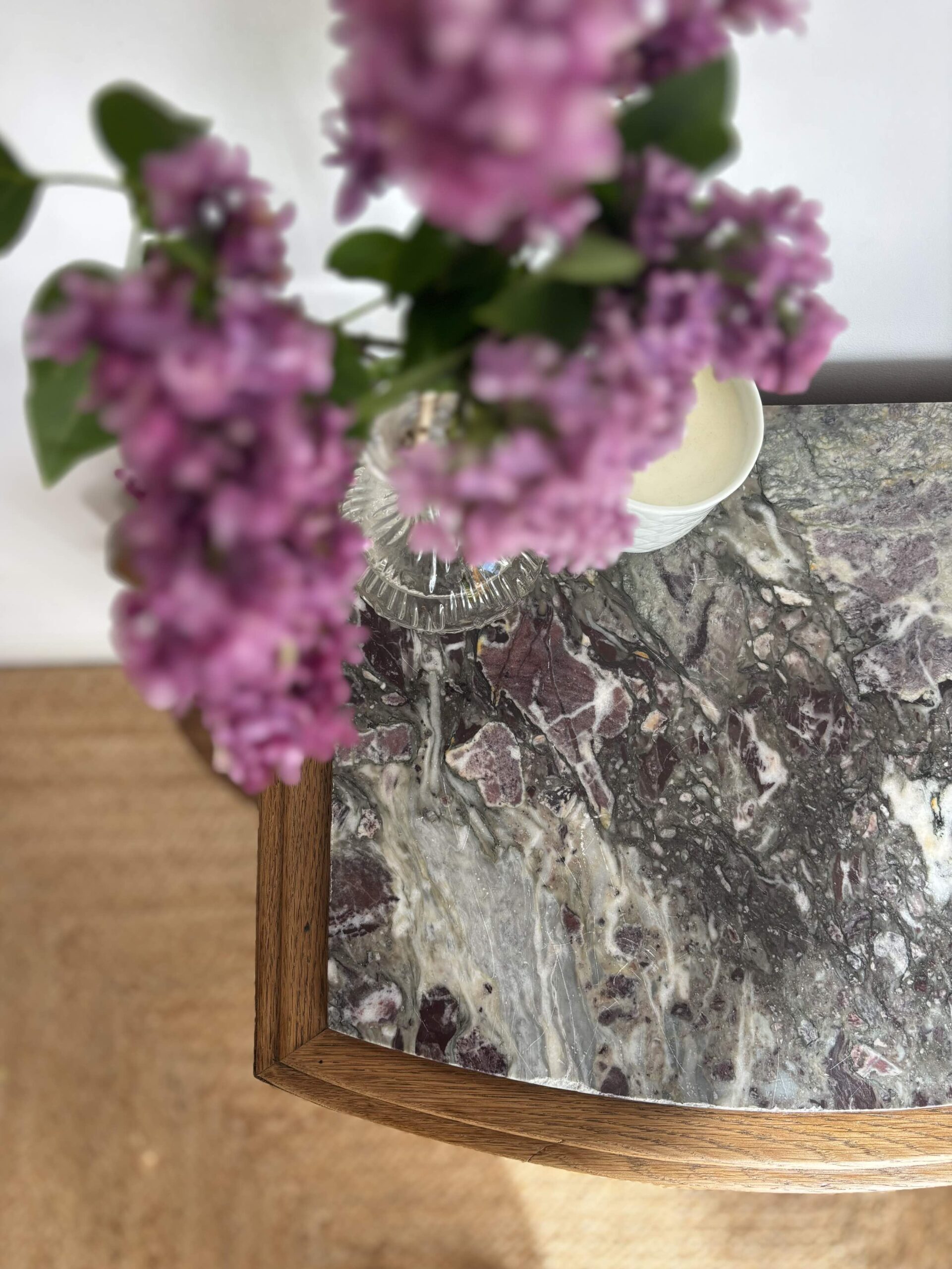 Le plateau en marbre d’origine, au veinage gris avec des inclusions mauves, a été nettoyé et huilé.