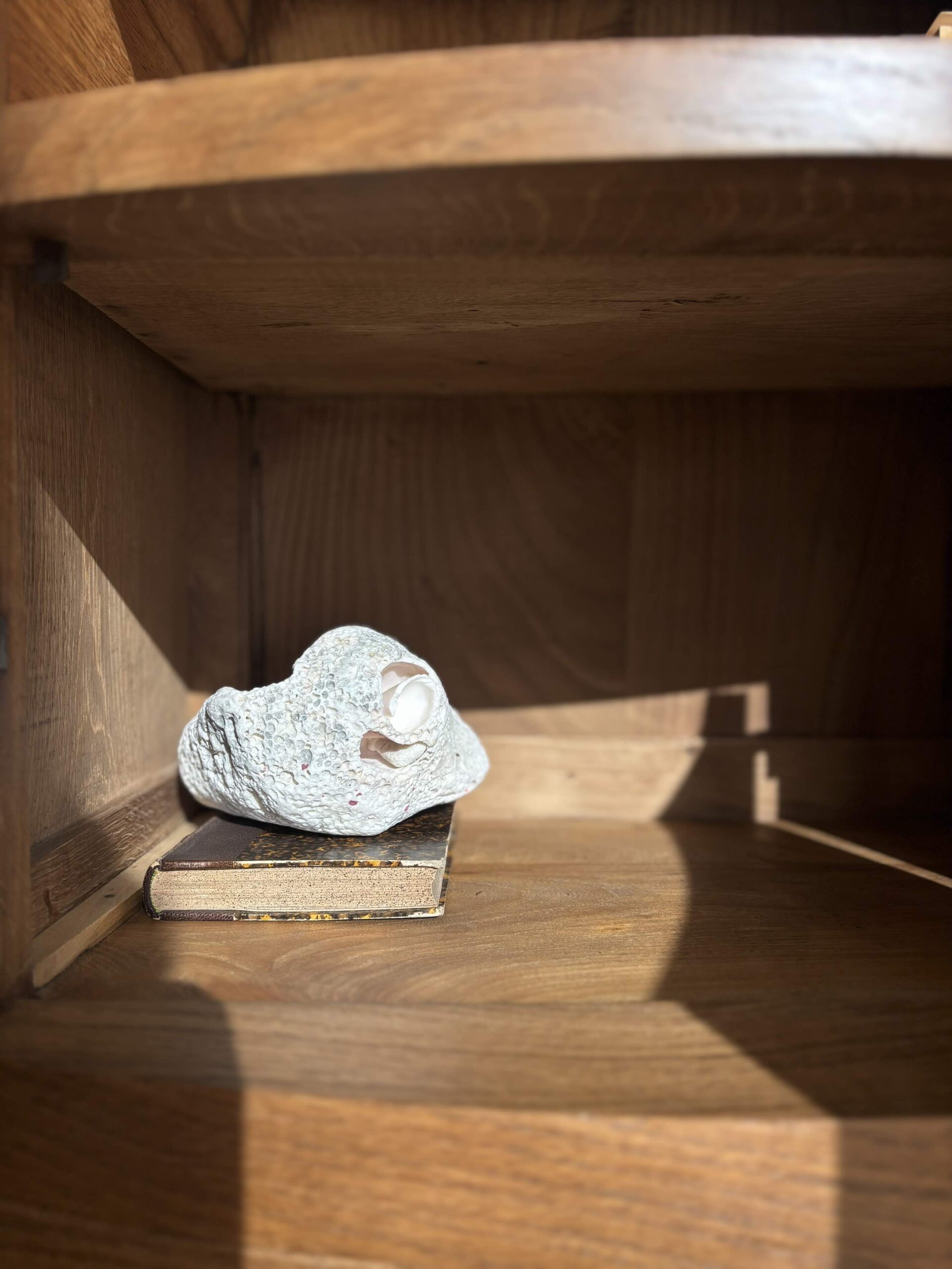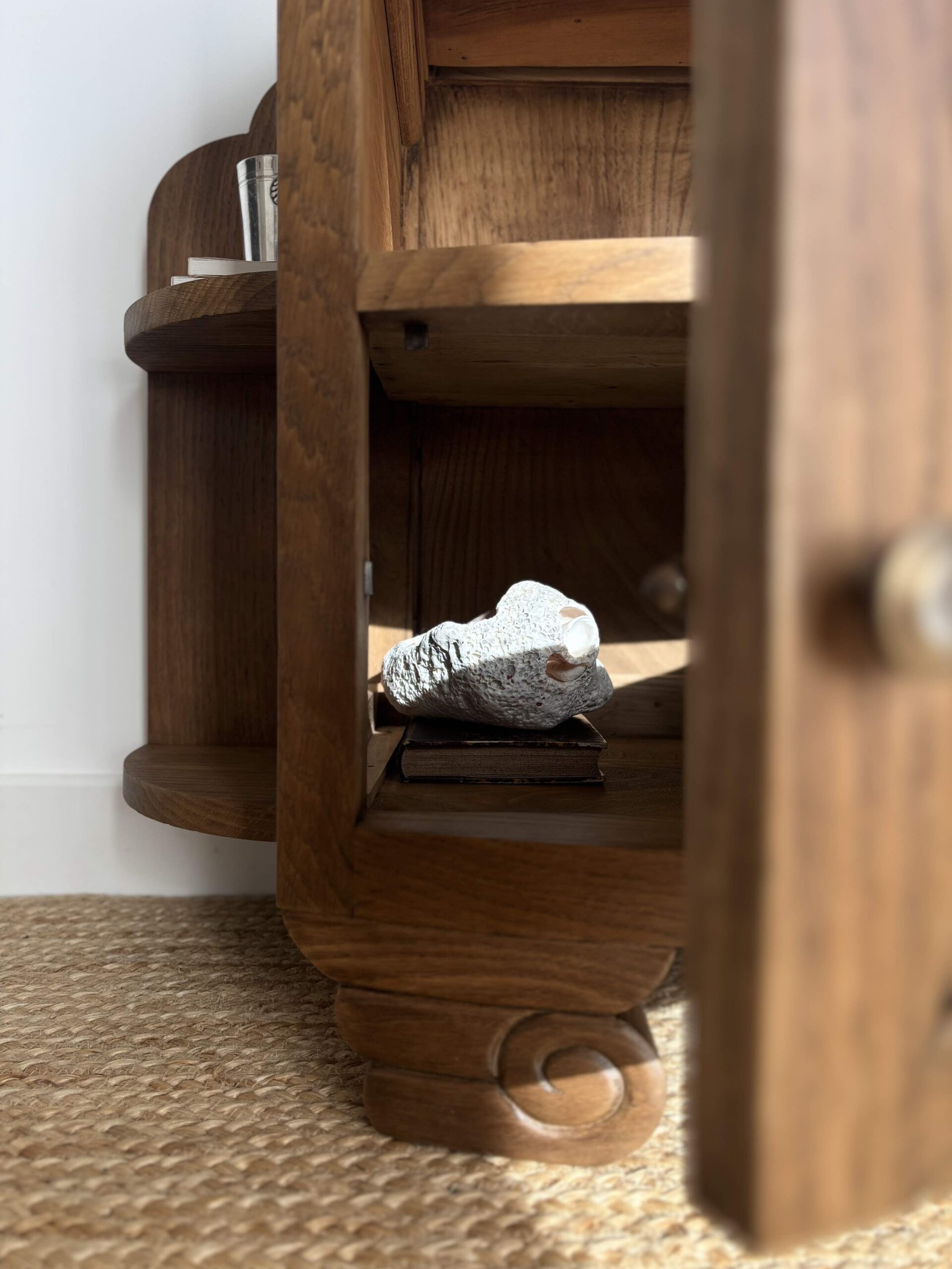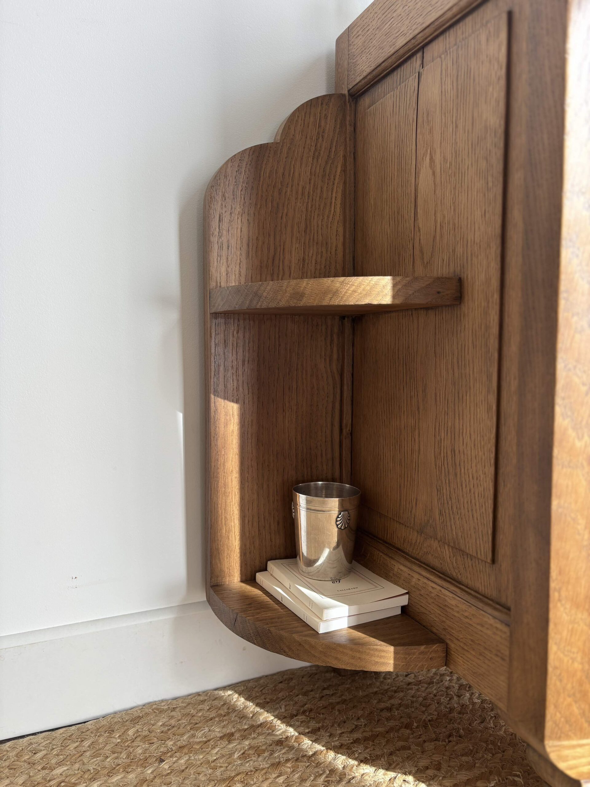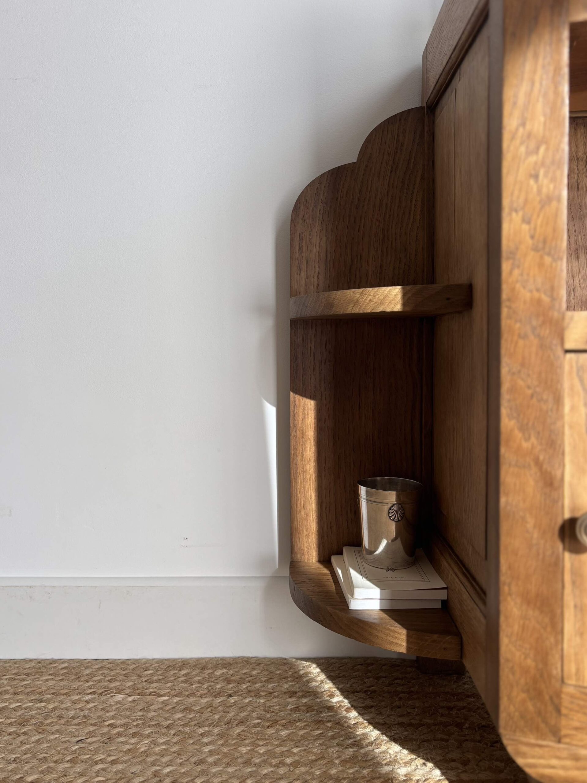 Il est composé d’un tiroir surmontant un espace de rangement ouvert, et un espace de rangement fermé par une porte. À gauche, deux petites étagères sur un fond en bois arrondi comme un nuage permettent d’exposer de jolis objets.