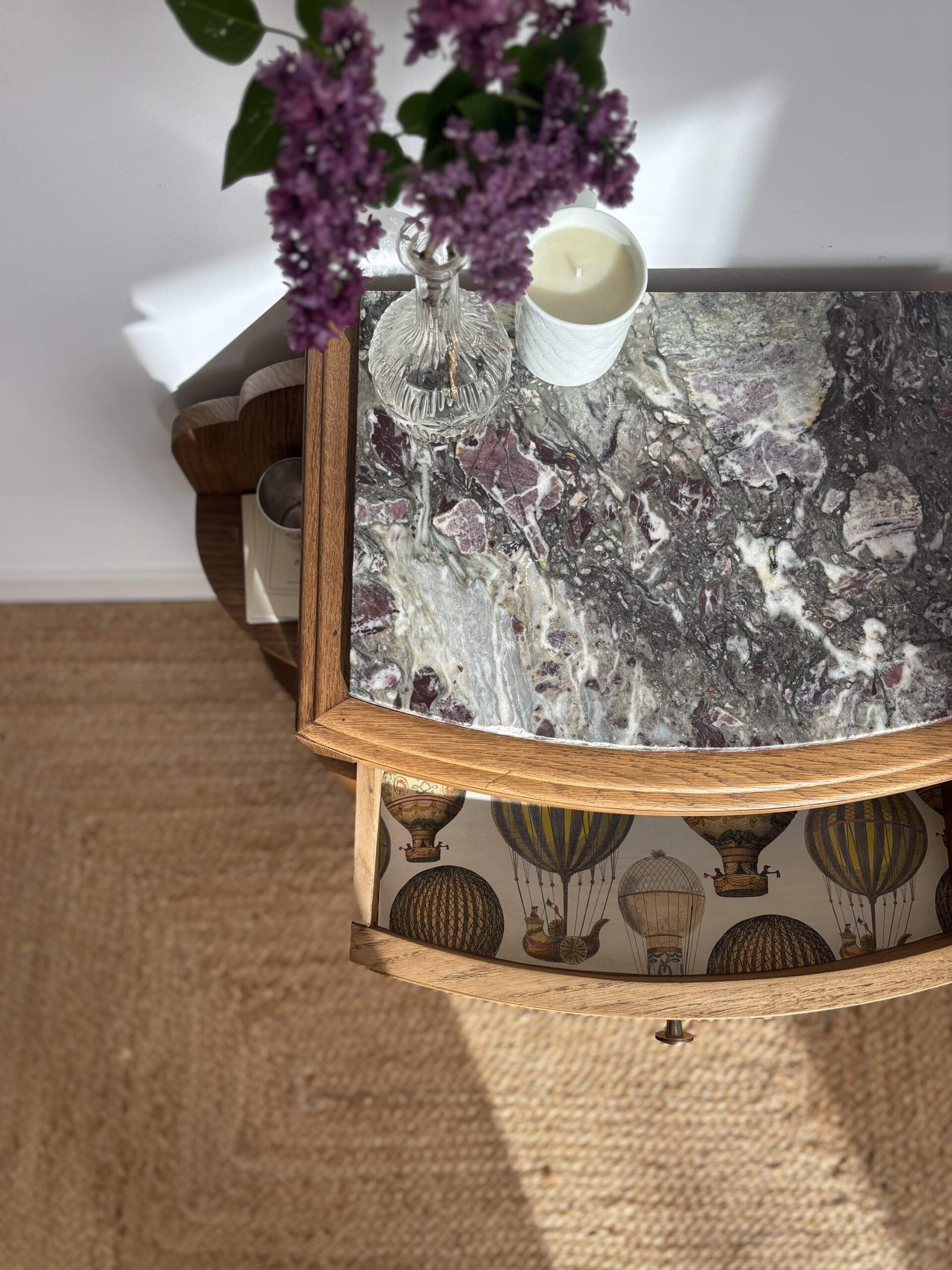 L’intérieur du tiroir a été tapissé d’un papier italien aux motifs montgolfières.